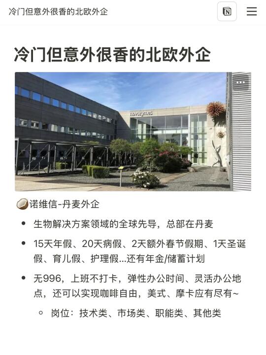 都说想躺平就去北欧外企,怕是真的! 整理了一下发现北欧外企是真的很舒服,无论是环境还是氛围~ . 🏔️-年假15天+ 🏔️-支持居家办公 🏔️-弹性上下班 🏔️-女性友好 大多数北欧外企都满足 . p1-p3是他们详细的介绍,岗位、福利都写了 p4是大家一直催我整理的外企资料,包括有5000+外企信息、内部面试资料、还有超100页的神仙外企名录,需要的直接来找我就行 . 每天更新优质社招资源,帮大家在找工作路上顺利拿offer! .