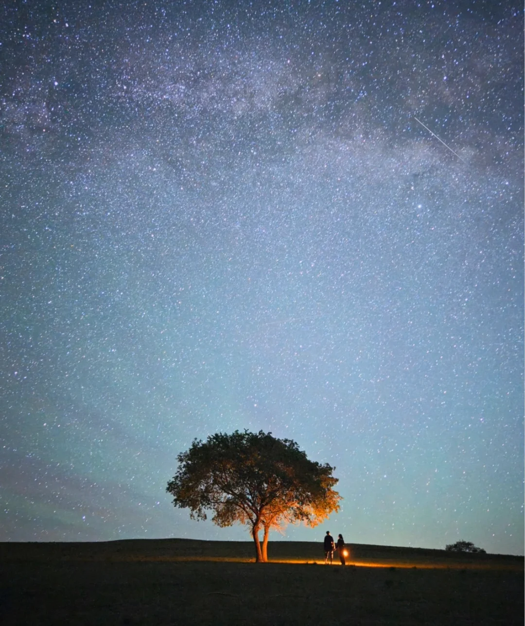 零星的几棵树,在大草原里的场景,旁边还有牛羊
