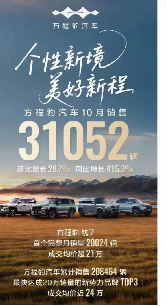 太炸裂了,暴涨! 据有关消息称,10月份,比亚迪方程豹销量突飞猛进,销量高达31052 辆,环比增长 28.7%,同比暴涨 415.3%。累计销量突破 20 万大关。旗下品牌豹7功不可没。