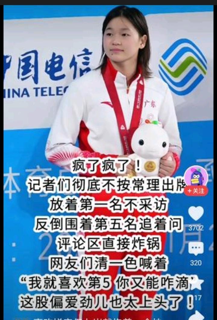 全红婵双人赛得第五,可是记者却追着她采访,第一名反而被冷落。 网友说,谁第一我也不关心,我只关心全红婵第一还是第几?他第五,我就喜欢第五,他倒第一,我就喜欢倒第一。没有全红婵谁喜欢看跳水呀? 也是,许多网友都说,不是全红婵,他们还不知道跳水这一项目。 网友对全红婵的偏爱是真心的。 当然,全红婵也不可能辜负网友对她的喜欢,在今后的日子里,好好疗伤,在明年接下来的大赛中,再创佳绩!