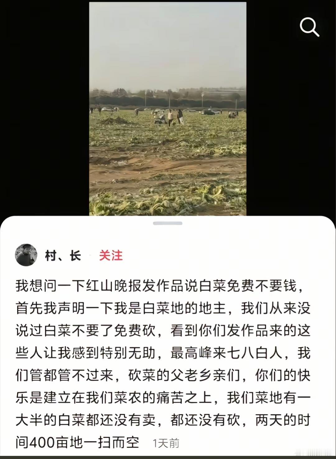 红山晚报发布造谣视频说可以免费捡白菜,导致400亩白菜被哄抢! 关键是红山晚报在发布视频的时候,还称是原创视频,还对相关人员进行了采访。然后他们就将这个造谣的不实新闻大规模传播导致了该片菜地最高峰有七八百人去“免费”抢白菜。 标题使用名称是“继免费捡土豆后又有新惊喜,赤峰一地可以免费砍白菜”“最后我们收获满满,非常开心”。 菜农在相关视频下留言,他说他们一半的白菜都没有收割,这些全部都是准备卖的白菜,两天的时间把他们菜地的白菜给一扫而空。 根据相关法律规定,相关造谣人员不仅要付出民事赔偿责任,还要付出刑事处罚责任,参与抢菜的人也逃脱不了法律的制裁。 各位是怎么看的?欢迎评论区留言。