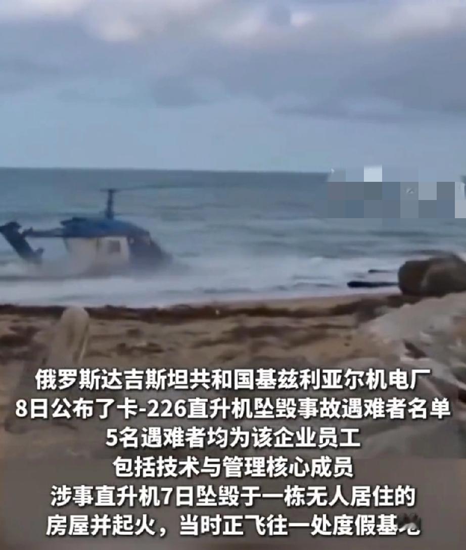 11月7日,俄罗斯达吉斯坦共和国基兹利亚尔机电厂的5名技术和管理核心成员,搭乘一架卡-226直升机,前往一处度假基地。 直升机在一岸边突然下坠,尾部刮到地面被损坏,拉升后,拖着断尾继续飞行。到达水面上,直升机再一次下坠,落水后又拉升飞行。最终,直升机坠落在一栋无人居住的房屋,燃起了大火。4人当场死亡,机械师重伤,送到医院没能抢救过来。 好生奇怪,直升机里面的人明明有活着的机会。第一次是直升机与地面刮蹭,说明已出现故障。第二次坠到水里了,还没有引起重视,丧失了最后的机会。也许机组人员过度自信,导致了悲剧发生。目前,俄方正在调查研究是什么原因导致直升机坠机。 俄多名航空技术人员坠机身亡