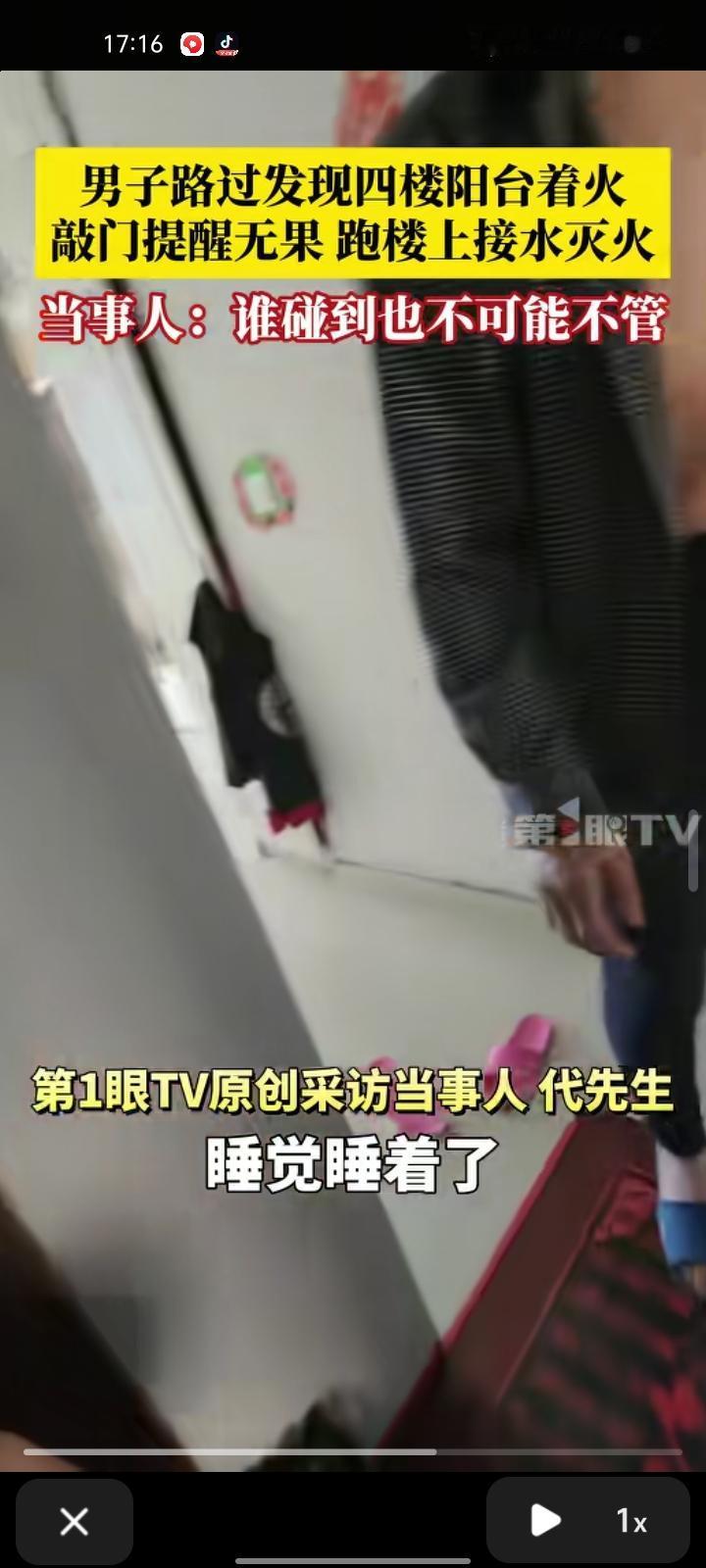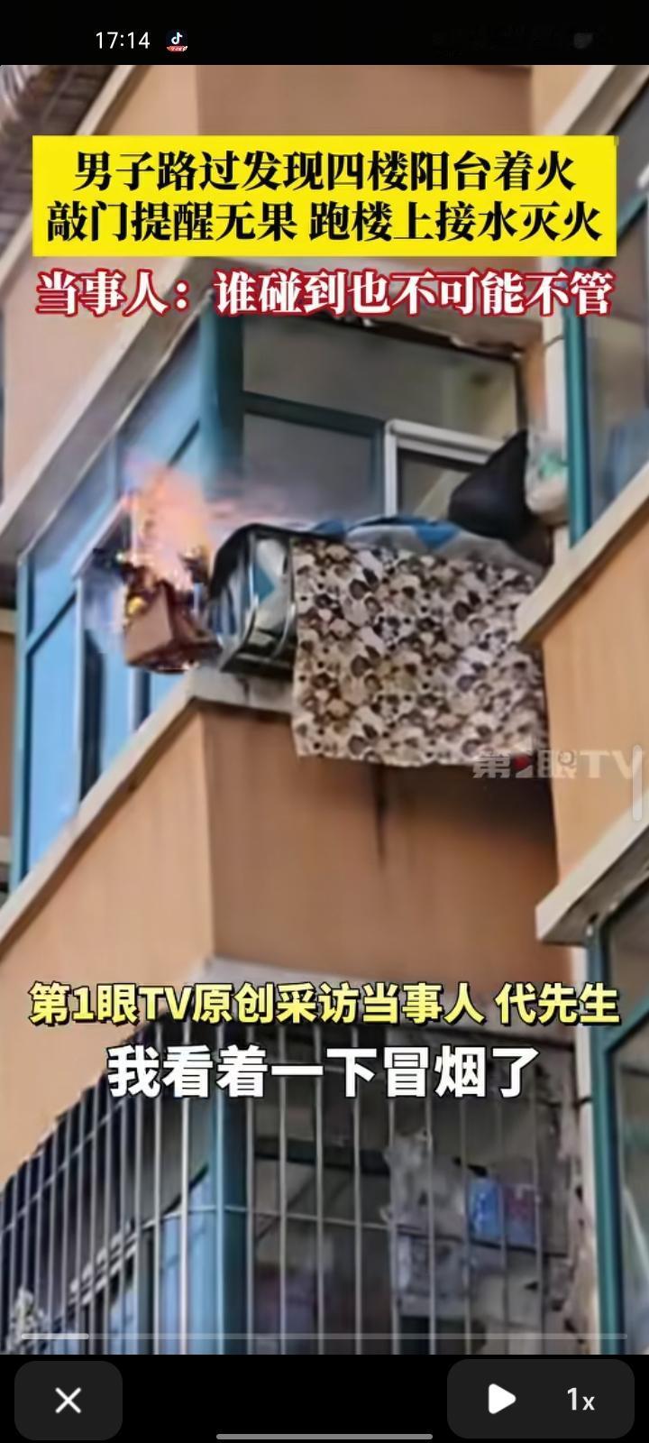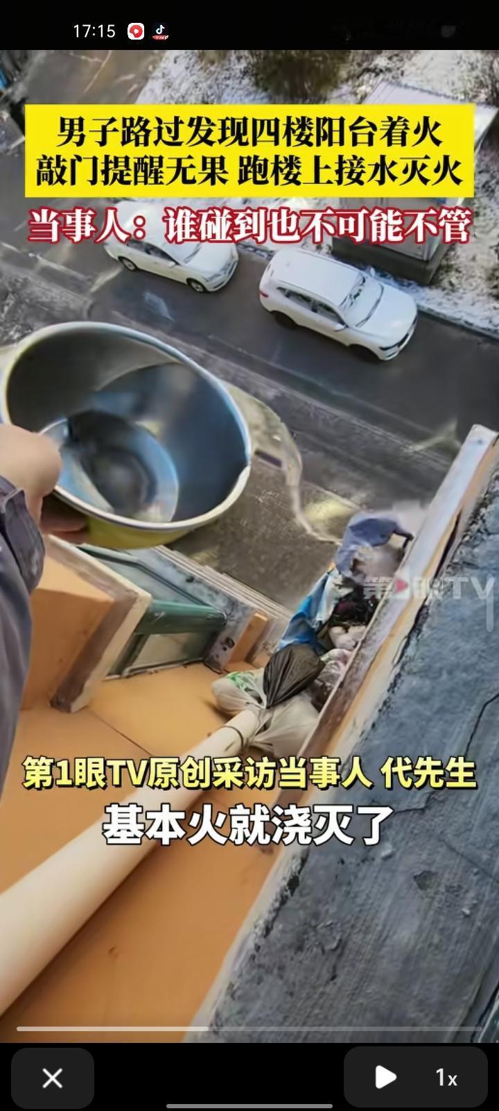 11月7日,黑龙江七台河。男子路过小区时发现四楼阳台着火,去四楼敲半天门都没反应,又跑到楼上接水往下面灭火。浇灭后,男子听到楼下有动静,原来四楼住户睡着了,没察觉到火烧起来了。 当事人代先生表示,谁碰到也不可能不管,火势大了损失更大,伤到人就不好了