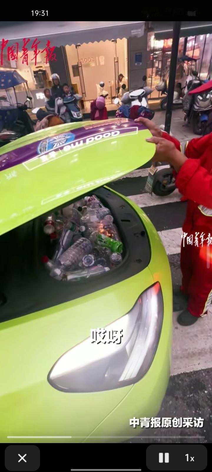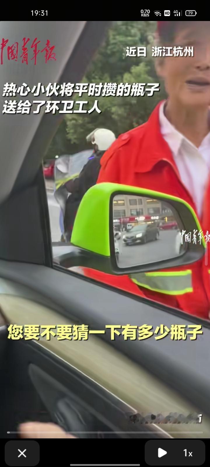 11月8日,浙江杭州。热心小伙把平时攒的瓶子送给环卫工人,环卫工打开前备厢,瞬间开心爆棚。 当事人彭先生表示,一开始想逗奶奶玩一玩,然后给她小惊喜。我觉得我比他们开心更多,这可能是赠人玫瑰手留余香最好的一个含义吧。