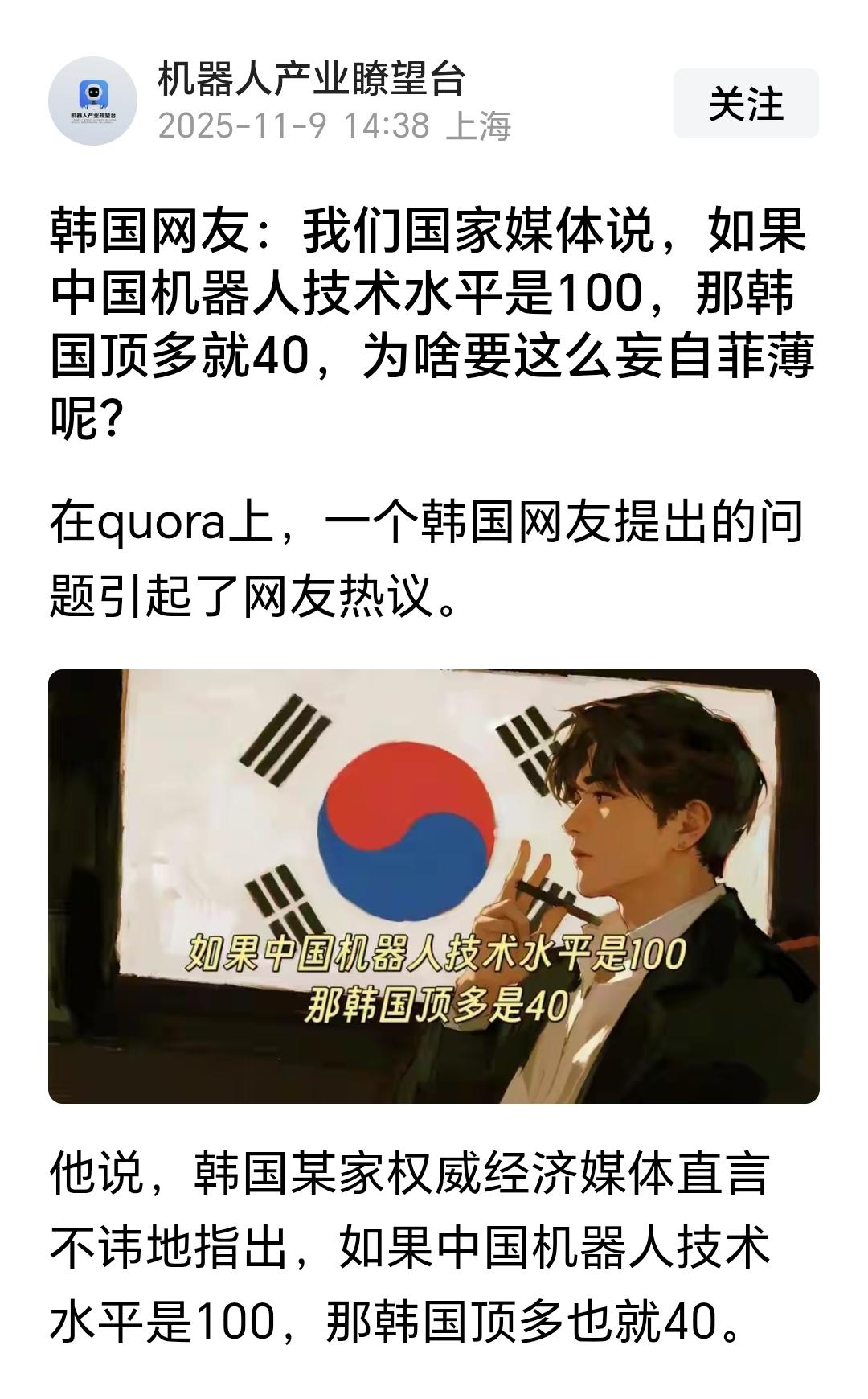 好难得韩国人居然这样谦虚了。韩国人说他们的媒体讨论机器人产业时认为中国是100韩国只有40。 现在机器人这个赛道,只有中美两国,更准确地说,只有中国。美国都不能算是中国强有力的竞争者。波士顿动力转手好多次都卖给韩国人了。现在只有马斯克还勉强在支撑。 比较一下马斯克的特斯拉从领先中国到现在被中国新能源汽车和智能驾驶的超越,机器人被中国甩远也是迟早的事。 所以,美国现在的落后都不能算追赶者,只能算一个还没被中国甩远的落后者。 这就是现在全球机器人的真实格局。 这个中间怎么没有日本和欧洲的信息呢?互联网的班车他们都没有赶上,这趟车他们更是连影子都没有看到。 所以,他们还有希望吗?[奸笑] 点右上角关注我,我们一起去看这个魔幻的世界