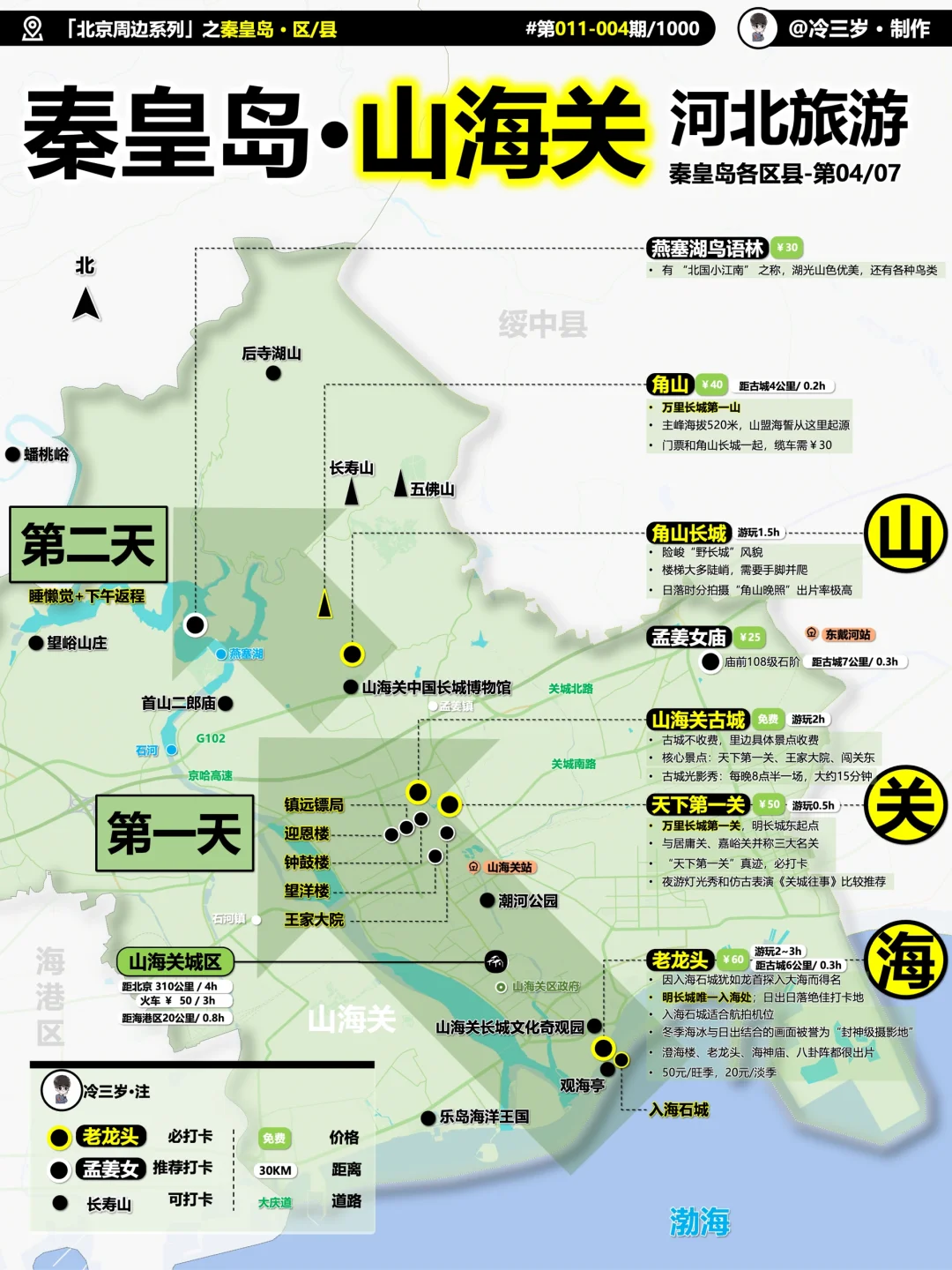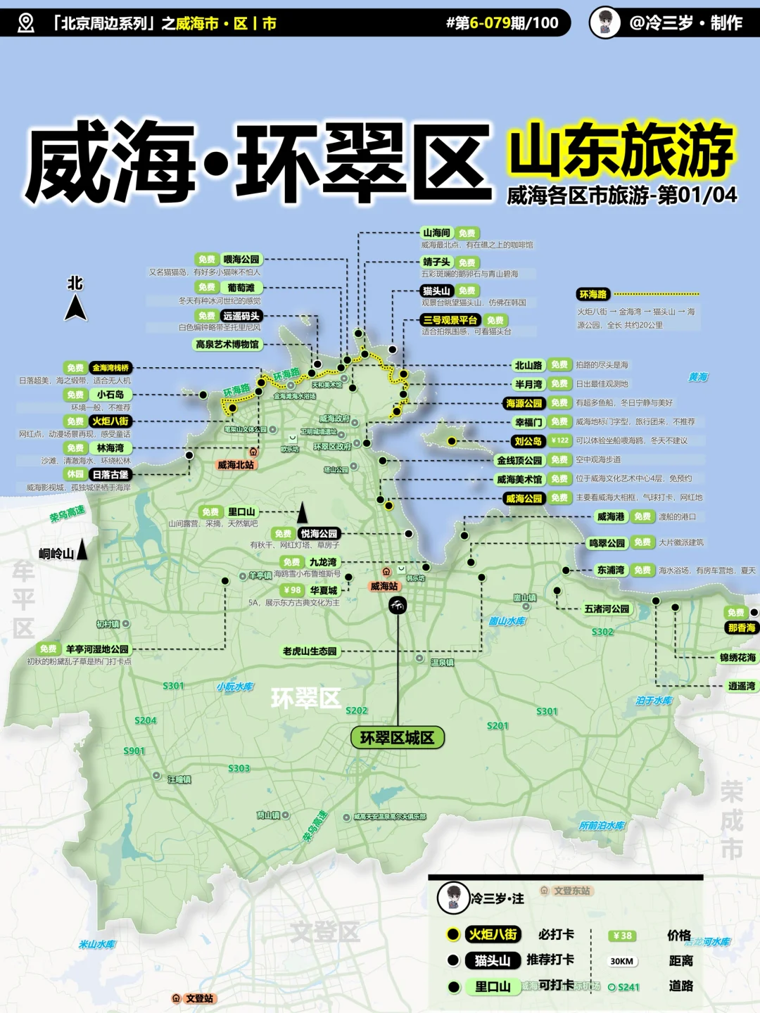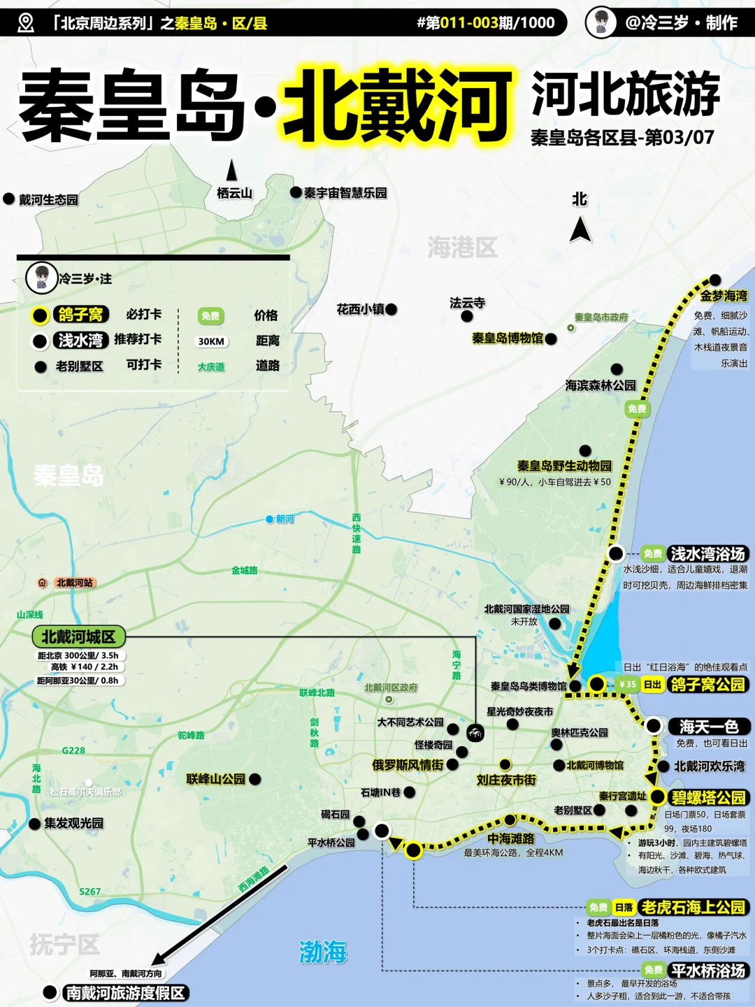 之前盘点了一个系列,供参考 最近几个月 在陆续把各区县,小城可玩的也陆续做出来了 [一R]秦皇岛:图2-5,山海关,海港区,北戴河,昌黎县 [二R]唐山:图6-7,乐亭县,曹妃甸 [三R]天津:图8,滨海新区 [四R]烟台:图9-11,芝罘,莱山,牟平 [五R]威海:图12-13,环翠,荣成 [六R]青岛:图14-17,即墨,黄岛,市南/市北,胶州 [七R]日照:图18,东港 主要是这些吧,有些还没画完 反正够大家端午出去玩了