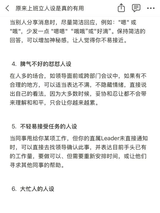 1️⃣做事靠谱但身体娇贵的脆皮人设 2️⃣早睡晚起养生的人设 3️⃣沉默寡言的人设 4️⃣脾气不好的怼怼人设 5️⃣不轻易接受任务的人设 6️⃣大忙人的人设 7️⃣家远通勤时间很长的人设 8️⃣家教严的人设 . 不仅是个职场博主,分享真实有效的信息;还会不断分享成长干货,帮助大家提升自我! .