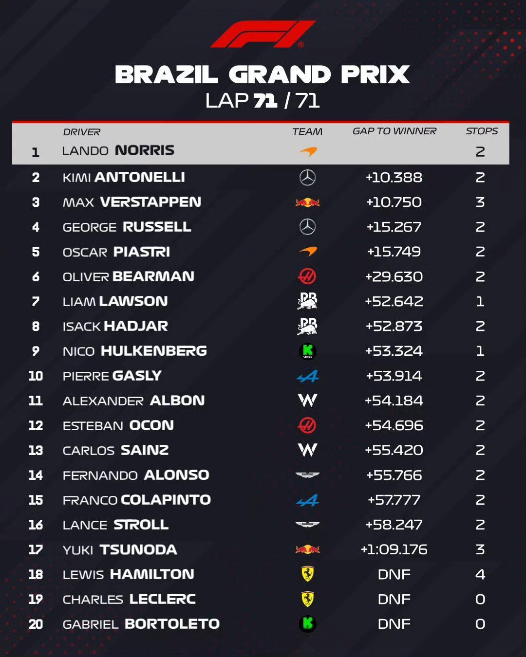 2025F1圣保罗大奖赛正赛,诺里斯称霸,法拉利双退,维斯塔潘维修区发车登上领奖台。 车手总冠军越来越靠近诺里斯,巴西站结束,诺里斯390分,皮亚斯特里366分,维斯塔潘341分。 乐扣被卷入皮亚斯特里和安东内利的事故退赛,这起事故他没有责任,但却是唯一承担后果的人。 皮亚斯特里被罚时10秒,超级驾照扣2分,安东内利什么处罚都没有。