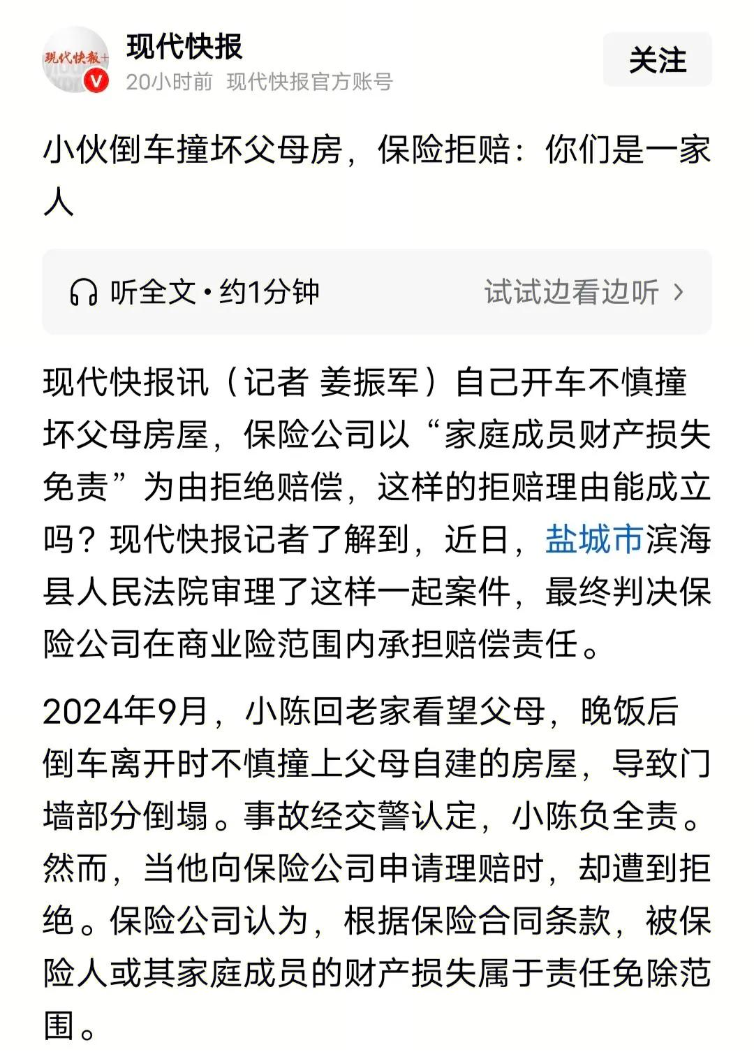江苏盐城男子小陈假期回老家看父母,返程倒车时意外撞塌父母自建房门墙,交警认定他全责。本以为有车辆保险能赔付修房钱,却被保险公司以“撞的是家庭成员财产”为由拒赔。小陈愤怒起诉,法院最终判决保险公司必须赔偿!这起案件不仅帮小陈讨回公道,更戳破了保险合同里的“隐形陷阱”,教大家看懂“第三者”到底是谁。 一、暖心团聚变糟心:倒车撞了自家墙,保险居然不赔? 2024年9月,在城里打拼的小陈趁着假期回盐城乡下看望父母。一家人好久没团聚,父母做了满满一桌好菜,边吃边聊,其乐融融。 晚饭后,小陈想着第二天还要上班,就打算开车回城。可天色渐暗,加上心里还惦记着和父母聊天的事儿,倒车时一时分神,“砰”的一声巨响,汽车直接撞在了父母家的门墙上! 小陈赶紧下车查看,只见门墙塌了一片,砖块瓦片散了一地,好好的老家院子变得狼藉。他又愧疚又着急,赶紧报了警。交警到现场勘查后,认定小陈操作不当,负事故全部责任。 看着被撞坏的房子,小陈心想还好自己买了车辆商业险,应该能理赔修房费用。可等他提交材料找保险公司索赔时,却被泼了一盆冷水:“抱歉,你撞的是父母的房子,父母属于家庭成员,根据合同条款,家庭成员的财产损失我们不赔。” “我买保险就是为了应对意外,难道一家人出事就不算意外了?”小陈又气又无奈,多次和保险公司沟通都被拒绝,最后只能一纸诉状把保险公司告上了法院。 二、法律拆解:这两个关键点,决定保险公司必须赔! 很多人可能会疑惑:保险公司的条款写着“家庭成员财产免责”,为啥法院还判赔?其实这里面藏着两个关键法律点,用大白话一说就懂: 1. 父母的房子,算不算“第三者财产”? 《保险法》第62条说,除非家庭成员故意造成事故,否则保险公司不能拒绝赔偿。这里的核心是“第三者”的认定:如果被保险人(小陈)和家庭成员(父母)没共同生活,财产也分开,那父母的财产就属于“第三者财产”。 法院查明,小陈长期在城里生活,父母住乡下,双方没共同居住,房子也是父母自建、产权明确归父母,完全符合“第三者财产”的条件。而且小陈是意外撞墙,不是故意骗保,保险公司没理由拒赔。 2. 保险合同的“免责条款”,不是写了就有效! 保险公司拒赔的依据是格式条款——就是那种提前印好、没和投保人协商过的条款。根据《民法典》第496条,这种条款如果没以加粗、加黑等显著方式提醒投保人,也没口头或书面说明含义,就可能被认定为无效。 本案中,保险公司拿不出证据证明,当初签合同时给小陈提醒过“家庭成员财产不赔”这条,也没解释过范围。所以这条免责条款对小陈根本没用,保险公司必须担责。 简单说:小陈撞的是“独立第三方”的财产,而且保险公司没尽到提醒义务,判决赔偿既合法又合理。 三、网友热议:这判决太解气!保险套路该管管了 这事儿传到网上,网友们纷纷为法院判决点赞,同时也吐槽起了保险行业的“坑”: - 网友@隔壁老王:“保险公司双标玩得溜!平时推销保险说啥都赔,真出事了就找理由拒赔,还好法院明察秋毫。” - 网友@打工人小李:“我之前也遇到过,保险条款密密麻麻全是小字,谁看得懂?就该要求他们把免责条款单独列出来,逐条解释!” - 网友@法律博主阿泽:“关键是‘共同生活’和‘财产独立’!如果小陈和父母住一起,房子也有他的份,结果可能不一样,但本案完全符合理赔条件。” - 网友@吃瓜群众:“一家人就不算第三者?那如果不小心撞了配偶、子女的车,也不赔吗?这条款本身就不合理!” - 网友@宝妈倩倩:“小陈太冤枉了,本来就愧疚,还被保险公司刁难,还好他没忍气吞声,起诉是对的!” 四、结论:买保险别踩这些坑,你怎么看? 这起案件给所有车主提了个醒:签保险合同时,千万别稀里糊涂签字!遇到“免责条款”,一定要让保险公司明确说明,最好保留相关证据;如果是和父母、子女分开生活,财产独立,就算意外造成他们的财产损失,保险公司也不能随便拒赔。 不过网友也有疑问:如果是同住的家庭成员,意外撞坏家里的东西,保险到底该赔吗?保险合同里的“家庭成员”范围该怎么界定? 你有没有遇到过保险拒赔的情况?你觉得保险公司的“家庭成员免责”条款合理吗?欢迎在评论区分享你的经历和看法!