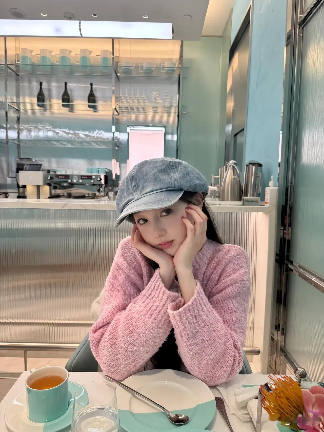 粉衣少女倚窗坐,茶香满溢心自怡。
