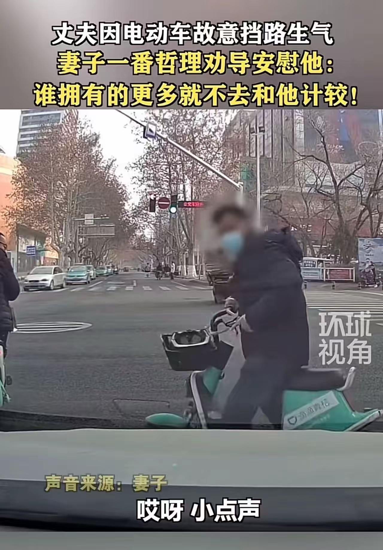 “真的贤妻夫祸少!”山东,丈夫因动电车故意挡路生气,准备和对方干一架时,妻子劝拦