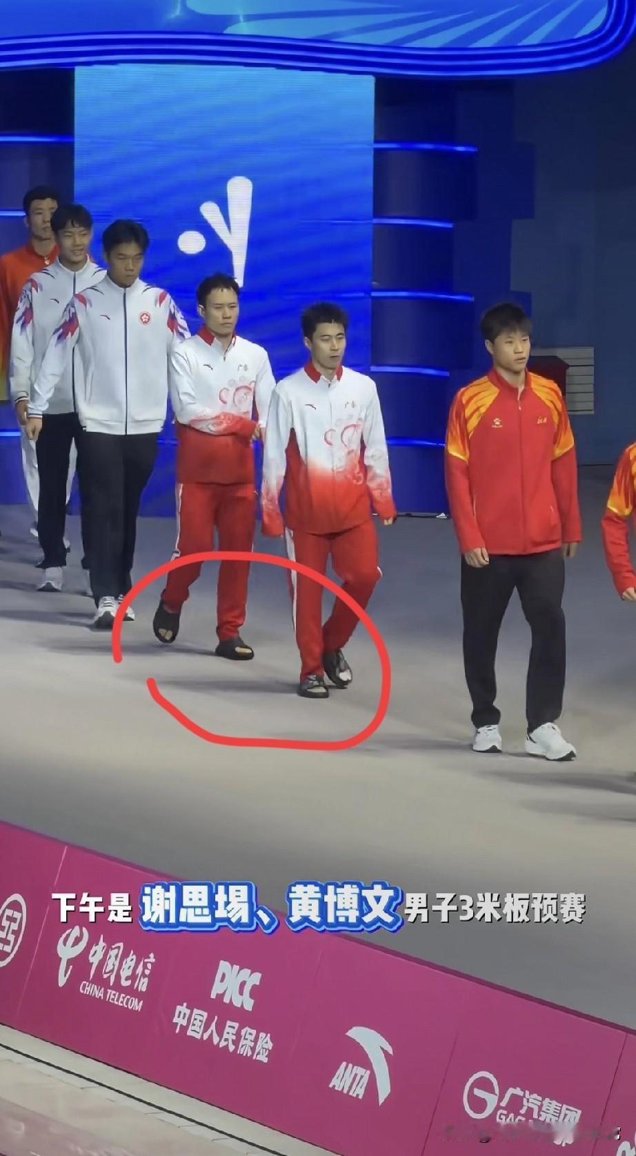 谢思埸穿拖鞋走全运会入场式,广东人的松弛感! 全运会跳水项目入场式,谢思埸和黄博文直接踩着凉拖就来了——左边队友穿白鞋,右边穿运动鞋,就他俩趿拉着黑拖,裤脚还晃荡着,把“广东人出门标配”焊在了赛场。 评论区直接炸锅:有人笑“这是刚从早茶摊赶过来吧”,有人替他俩捏把汗“不怕被教练罚吗”,还有广东网友补刀“没穿人字拖已经是给足面子了”。 但也有人较真:“这么正式的场合穿拖鞋,是不是太随意了?” ——到底是“松弛感”接地气,还是赛场该有赛场的规矩?你们觉得运动员入场穿拖鞋,该不该被吐槽?