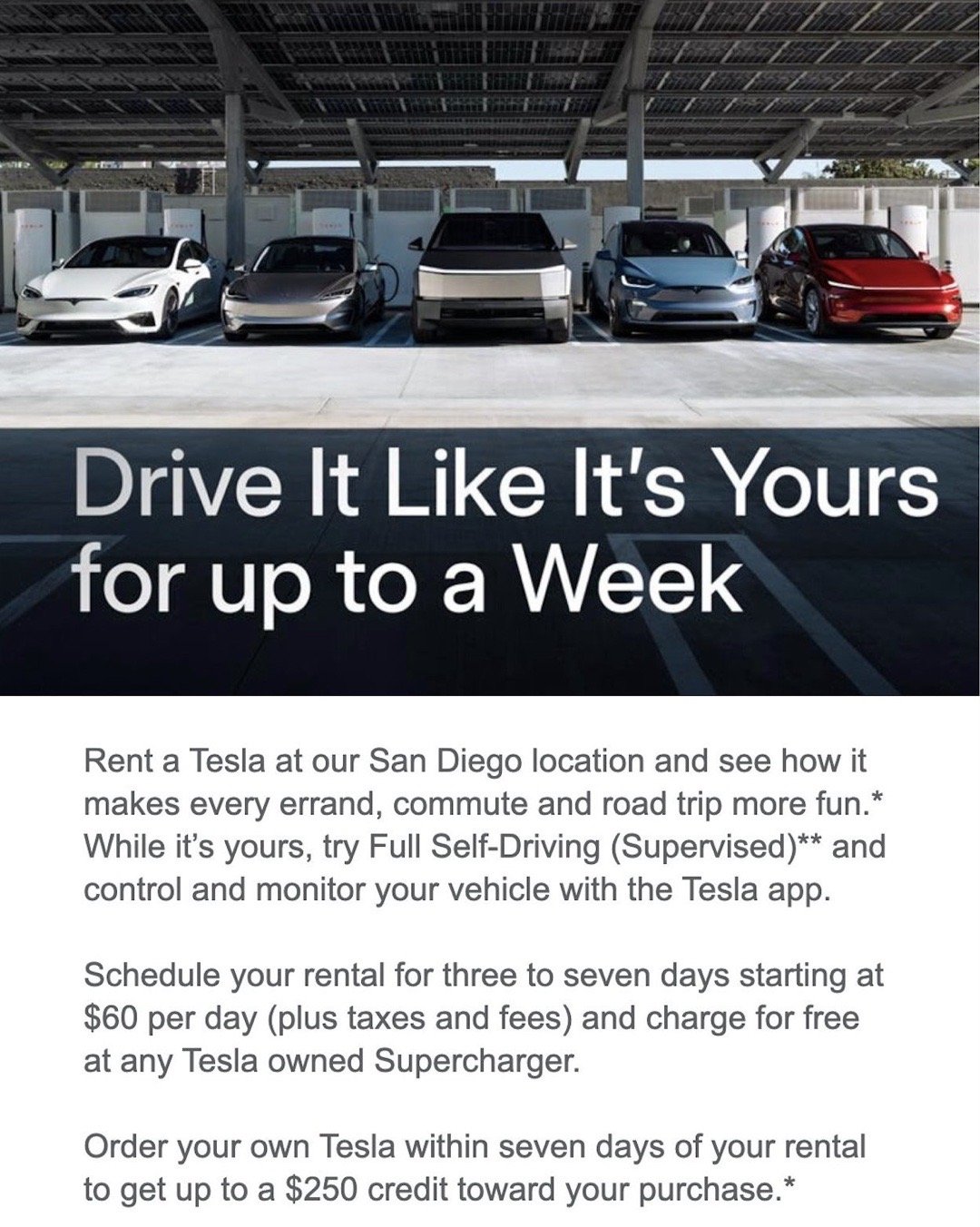 如果在租车后 7 天内订购一辆新特斯拉,将获得 250 美元的购车折扣。