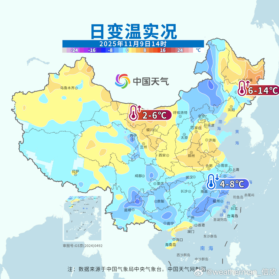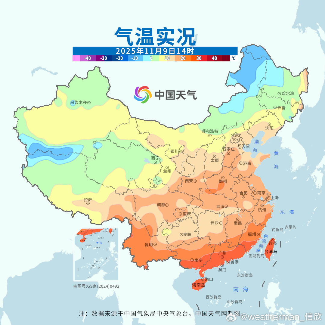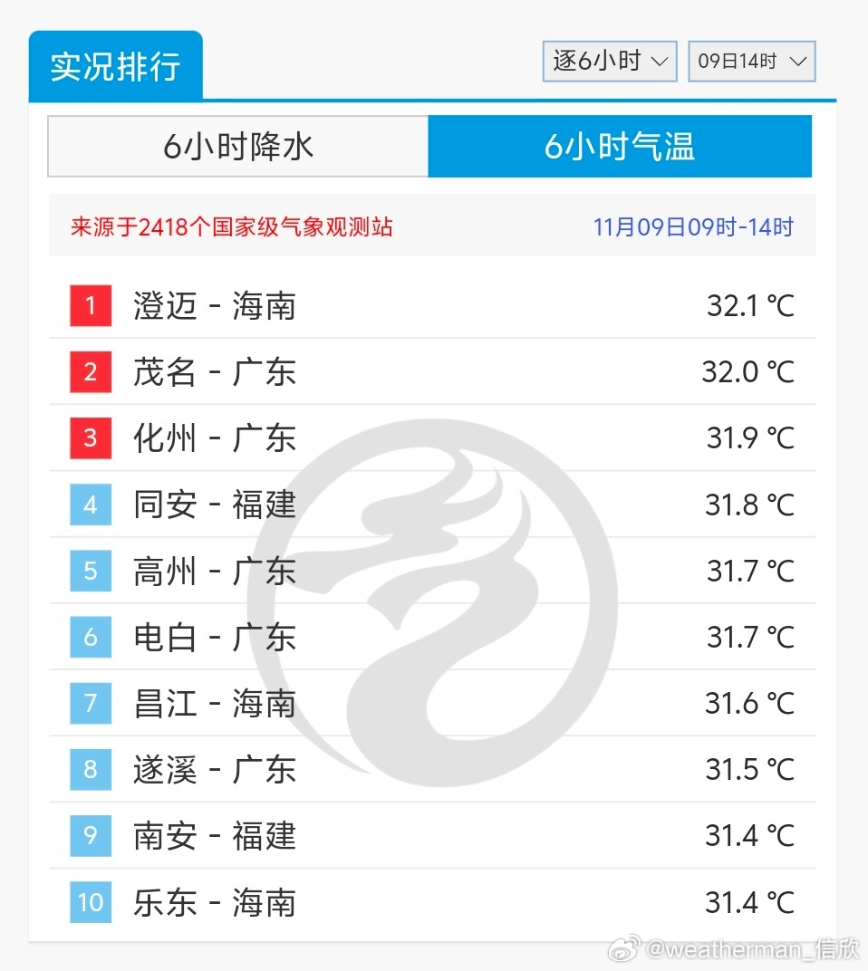 【气温】今天因为冷空气影响,内蒙古中东部出现降温。此外冷空气+阴雨使得南方多地也出现降温。不过华南部分地区,今天依然有点热,海南广东福建部分站点气温超30℃。今天南北温差依然很大,同时次海南澄迈比内蒙古图里河高了41.2℃。