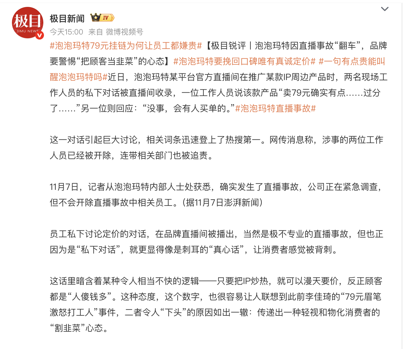 泡泡玛特直播事故上热搜有点莫名其妙,明码标价的产品,本身就没有什么值不值得,大家难道以前不知道它的成本没有这么贵?我记得之前有个拍卖会有个限量版的拉布布的最终成交价是108万,是因为商品本身的材料才贵吗?更多的还是因为它的品牌溢价,以及它作为孤品具有收藏价值,当然,也有赌的成分在,在赌拉布布能更火,能一直火,如果这样,这件孤品再次拍卖的身价可能会再翻几番。