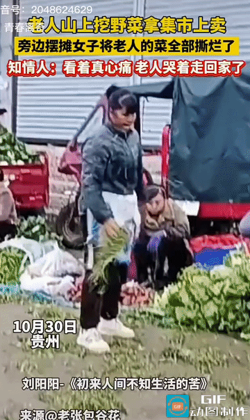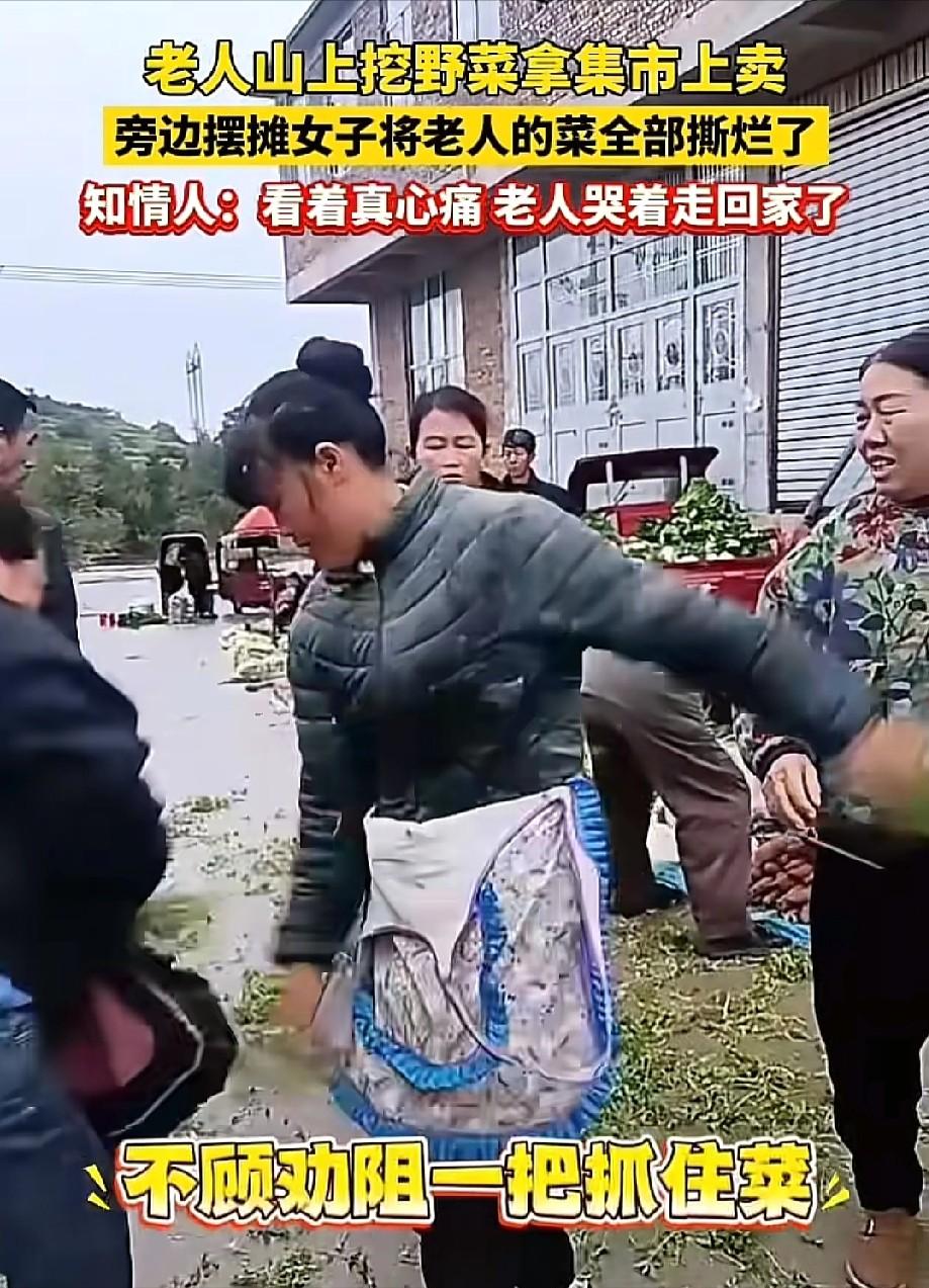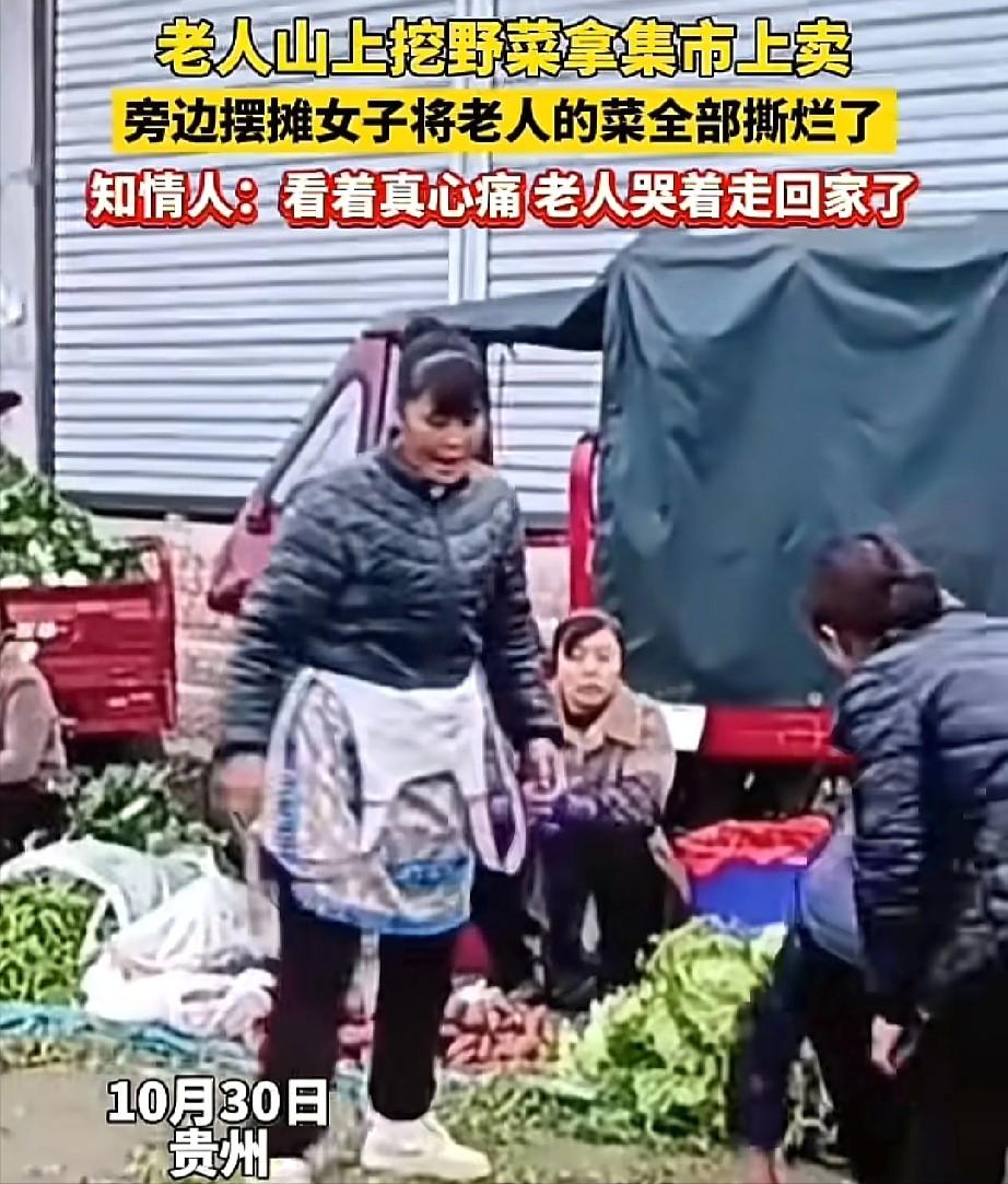 苦命人何苦为难苦命人?贵州一老人去山上挖野菜,想赚点生活费,便拿到集市上卖。不料,一旁摆摊的女子嫌生意被抢,就将老人的野菜撕烂,老人颤颤巍巍的捡起烂菜,哭着走了。 贵州一个乡镇集市的早市上,七十多岁的王大爷蹲在路边,正把刚从山上挖的蕨菜、蒲公英分类摆进竹篮,突然一只手伸过来,猛地将竹篮掀翻,嫩绿的野菜撒了一地,还没等他反应过来,旁边摆摊的女子已经踩着菜叶来回碾,嘴里还念叨着 “让你抢生意,看你还怎么卖”。 这一幕被路过的市民拍了下来,视频里王大爷颤巍巍蹲在地上,用布满老茧的手一片片捡着烂菜叶,浑浊的眼泪顺着皱纹往下掉,看得人心里发堵。 事情发生在10月30号,天刚蒙蒙亮,王大爷就背着竹篓从二十多里外的山村赶到集市。他老伴常年卧病在床,儿子在外打零工一年也回不来一次,家里的开销全靠他种点庄稼和上山挖野菜补贴。 入秋以后山里野菜少了,他每天要爬两个多小时的山,才能挖满一竹篮,拿到集市上按三块钱一把卖,运气好的话一天能赚五六十块,够买几天的降压药和老伴的止痛药。 那天他选的摊位在集市角落,旁边是卖腌菜、酱菜的李姐。李姐在这摆摊五年了,主要靠卖自家做的酸豆角、泡萝卜为生,最近几个月生意不太好,有时候一天营业额还不到一百块。 看到王大爷把野菜摆出来,路过的人都凑过去问价,有几个原本要在李姐摊位买腌菜的顾客,也转身买了王大爷的野菜,说 “新鲜野菜炒着吃比腌菜健康”。 李姐越看越气,觉得王大爷是故意抢她生意。她先是阴阳怪气地跟旁边摊主抱怨 “有些人就是没规矩,哪有空位就往哪挤”,见王大爷没回应,又走过去说 “这地方是我先占的,你换个地儿”。王大爷小声解释 “这是公共区域,没说归谁”,就是这句话彻底点燃了李姐的火气,她伸手就把王大爷的竹篮掀了。 周围摊主赶紧上前拉架,有人帮王大爷捡野菜,有人劝李姐别冲动。李姐却没停手,还说 “我生意不好,他也别想好过”,直到市场管理员过来,才把两人拉开。管理员了解情况后,让李姐给王大爷道歉并赔偿损失,李姐却不情不愿,只掏了二十块钱,还嘟囔着 “算我倒霉”。 王大爷拿着那二十块钱,看着篮子里被撕烂、踩碎的野菜,蹲在地上哭了好久。有摊主看他可怜,凑了些零钱塞给他,还有人把自己摊位上的蔬菜分了一些给他。王大爷连连道谢,最后把还能吃的野菜收拾好,背着空了大半的竹篓,慢慢走出了集市。有市民跟着他走了一段,发现他没回家,而是去了镇上的药店,用那二十块钱和凑来的零钱,买了几盒最便宜的止痛药。 这段视频传到网上后,很快引发热议。有网友指责李姐 “同为底层人,何苦为难底层人”,觉得她不该把生意不好的怨气撒在老人身上;也有网友理解李姐的难处,说 “小摊贩赚点钱不容易,竞争压力大容易冲动”。当地市场监管部门后来联系了两人,对李姐进行了批评教育,还帮王大爷在集市里找了个固定的免费摊位,让他以后不用再担心被人驱赶。 其实在很多乡镇集市,像王大爷和李姐这样的小摊贩还有很多。他们大多没什么稳定收入,靠着小本买卖维持生计,一点点利益冲突都可能引发矛盾。王大爷挖野菜是为了给老伴买药,李姐守着摊位是为了养活一家人,本该互相体谅的两个人,却因为一时的冲动闹得不可开交。 对此,你们有什么看法,欢迎评论留言~