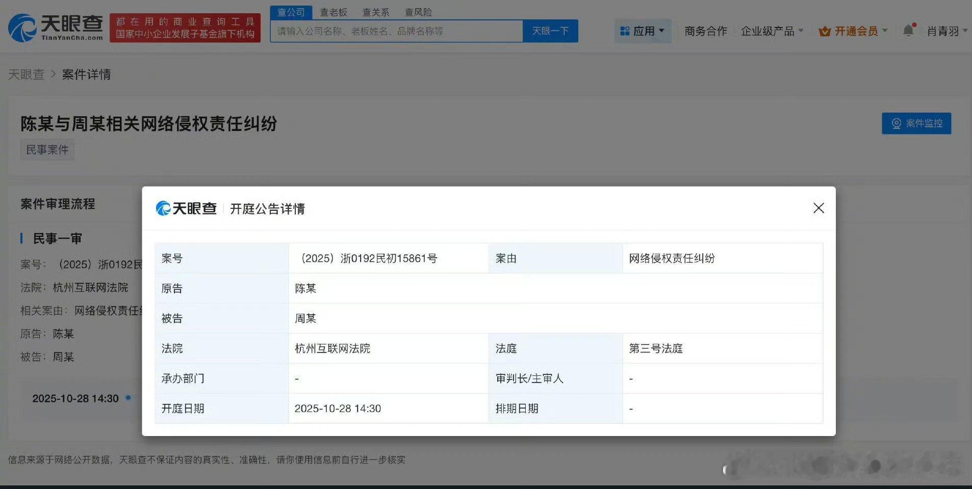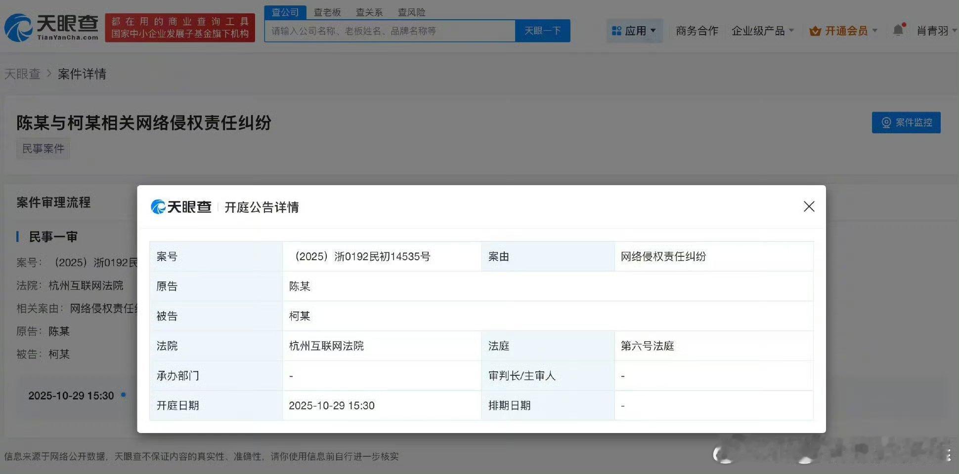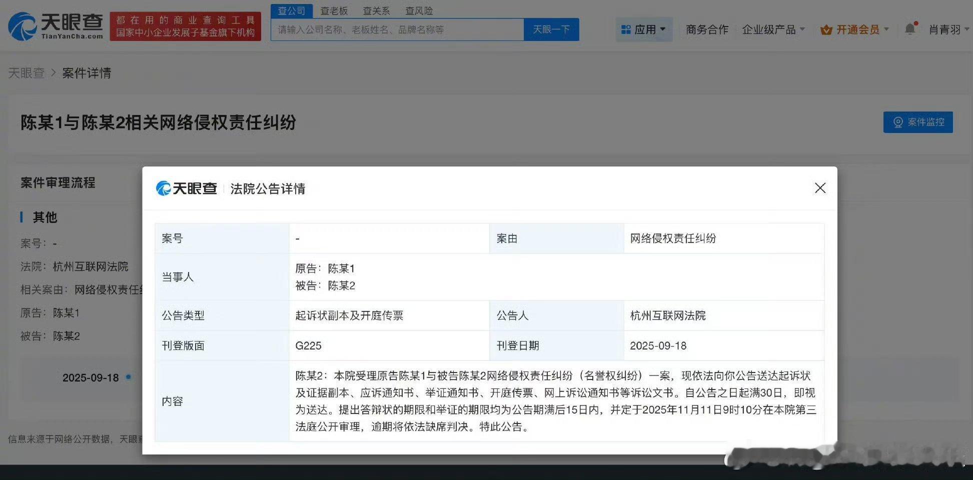 陈丽君网络维权案即将开庭杭州互联网法院向陈某公告送达陈丽君与其网络侵权责任纠纷案件起诉状及证据副本、开庭传票等~定于11月11日开庭审理。
