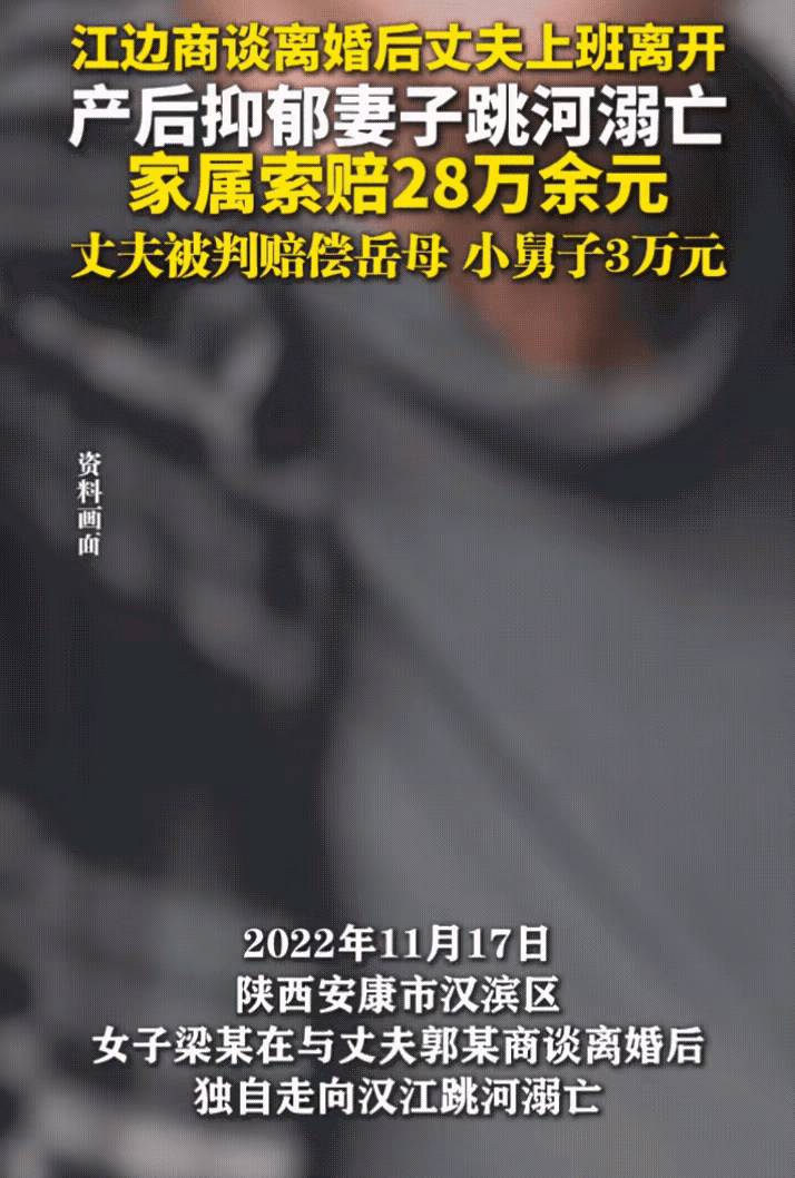 夫妻梁某和郭某因为感情不和,双方约定2022年10月分居。 此后,梁某一个人带娃,带着两个多月大的孩子,梁某刚刚生完二胎,身体也没有完全恢复,经常性地哭闹,还有产后抑郁症。 2022年11月17日晚上,梁某和郭某吃过晚饭,两人谈及离婚。期间,郭某说他急着要上班,就先走了。没想到梁某随后就跳江了。 法院审理认为,郭某没有尽到合理的照顾和保护责任,造成梁某的死亡,负有一定的责任。判决郭某赔偿梁某的母亲和弟弟各3万元。 此事件发生后,网友议论纷纷!婚姻最怕不沟通!家庭最怕没有责任! 麻烦看官老爷们右上角点击一下“关注”,既方便您进行讨论和分享,又能给您带来不一样的参与感,感谢您的支持!