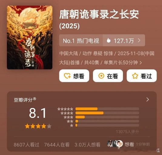唐朝诡事录3开分8.1分,1.3w人打分,好速度