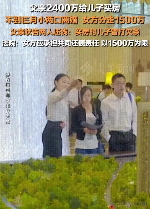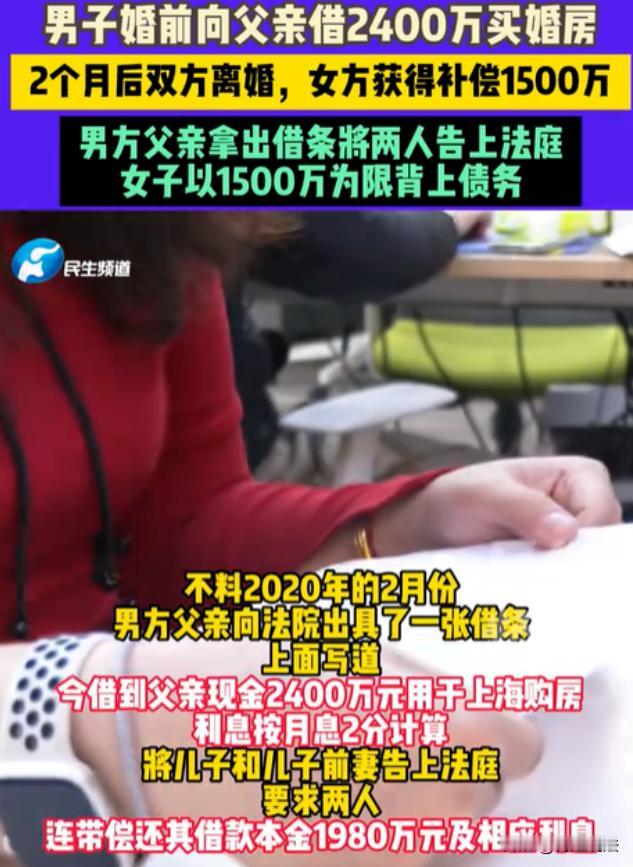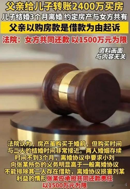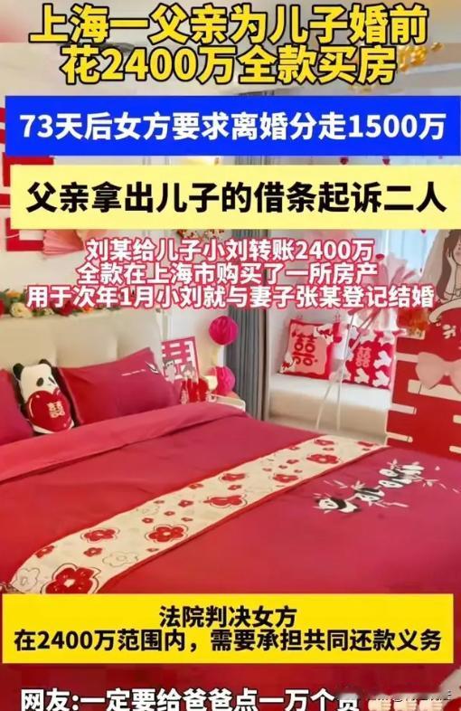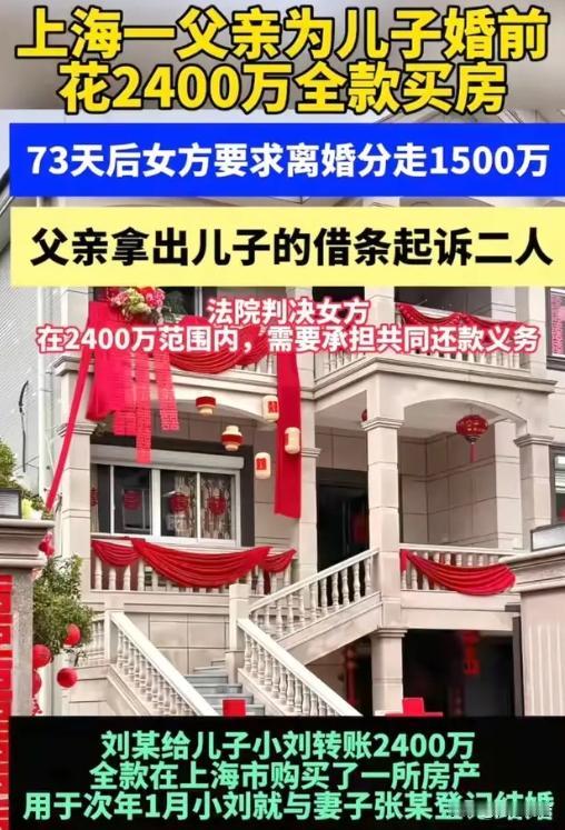 上海,一位大爷,为儿子能安稳成家,拿出前半辈子2400万的积蓄,全款给儿子买了婚房,儿子还打了借条,哪知婚后仅三个月,儿子儿媳就离了婚,更离谱的是,离婚协议里儿子竟把1500万分给女方,大爷懵了,辛苦攒的钱大半进了别人的腰包,他怀疑小两口合谋骗钱,这口气实在咽不下,只用了一招,钱就被全部追回来了! 老刘,一辈子省吃俭用,就盼着儿子小刘能成家立业。 2018年,眼看着儿子快结婚了,老刘把2400万积蓄全拿出来,给儿子在上海全款买了婚房,小刘还写了张借条。 2019年4月5日,一纸离婚协议,把老刘搞懵了,儿子小刘和结婚才三个月的儿媳张某离了婚,更离谱的是,离婚协议里小刘要把1500万分给张某。 老刘当时就蒙了,2400万的数目几乎就是他一辈子的积蓄,原本他就想着凭借这笔辛辛苦苦赚来的钱给儿子在外面好好地成家了,可现在刚进门才三个月的儿媳,就要离婚拿走1500万。 这钱是他和老伴省吃俭用攒下的,儿子结婚前他全拿出来买了婚房,就是想让儿子有个安稳的家。 可这安稳日子还没过三个月,小两口就离了婚,这1500万的补偿协议,让老刘怎么也想不通。 老刘觉得不对劲,怀疑这俩人合谋骗钱,可这事憋了三年,2022年,他实在忍不住,把儿子和前儿媳告上法庭,要他们还1980万本金和利息。 老刘说这钱是借给儿子的,有借条为证,现在儿子离婚了,钱不能就这么没了。 张某却说,欠条是婚前签的,和她没关系,钱是小刘借的,不该她还。 法院审理时发现,房子虽婚前买,但紧贴结婚日子,这2400万可不是小钱,老刘一下子全拿出来给儿子买房,明显是为了儿子结婚。 而且这婚姻才维持了90多天,就签1500万补偿协议,这明显不合理。 从法律角度看,这里涉及到借款和赠与的认定问题,老刘主张是借款,有借条为证,而张某认为这是赠与。 借款和赠与的区别,就是借款是要还的,赠与就是白给了,不用还。 老刘的2400万,到底是借款还是赠与呢? 根据《关于适用〈民法典〉婚姻家庭编的解释(二)》第8条规定,当事人结婚前,父母为双方购置房屋出资的,该出资应当认定为对自己子女个人的赠与,但父母明确表示赠与双方的除外。 小刘刘虽然写了借条,但关键还要看有没有明确表示赠与双方,从实际情况看,老刘是为了儿子结婚买房,没有明确表示赠与小两口双方。 根据《民法典》第1064条规定,夫妻双方共同签名或者夫妻一方事后追认等共同意思表示所负的债务,以及夫妻一方在婚姻关系存续期间以个人名义为家庭日常生活需要所负的债务,属于夫妻共同债务。 这2400万的债务,是用于婚后共同居住房屋,属家庭日常生活债务,张某知晓并参与房屋分割,离婚协议又异议,存在损害债权人利益嫌疑。 张某说欠条是婚前签的,和她没关系,这说法能成立吗? 根据法律规定,虽然欠条是婚前签的,但这债务用于婚后共同居住房屋,属于家庭日常生活债务,张某又参与房屋分割,所以她不能免责。 老刘的主张的利息,能得到支持吗? 这要看借条上有没有约定利息,如果有约定,且不违反法律规定,会支持,如果没有约定,一般视为没有利息。 最终法院判决,老刘转给小刘的2400万是借款,小刘得全额归还,张某因参与房屋分割且协议异常,需承担1500万共同还款责任。 婚姻本应是纯粹的感情结合,而不是某些人谋取财产的手段,老刘辛苦一辈子攒下的钱,差点就被这样不合理地分割了。