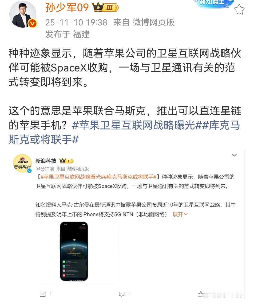 孙少军:意思是苹果联合马斯克,推出可以直连星链的苹果手机? 怎么看也是这个意思,意思是说明年开始苹果手机可以直接连接卫星信号? 如果真的搞成了,那个苹果手机,竞争能力将大幅度的提升,虽然我国有很多手机也可以连接卫星,但是还是有点不一样的,目前还是相当于是卫星电话,没有办法使用卫星的网络。 各位是怎么看的?欢迎评论区留言。