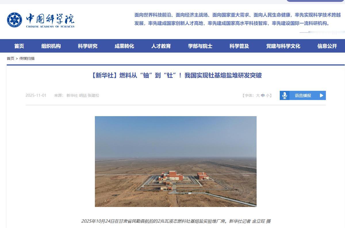 这下出名了!不止中国,连全世界都知道了!11月1日,中国科学院对外证实,由中国科学院上海应用物理研究所牵头打造的2兆瓦液态燃料钍基熔盐实验堆,近期成功完成钍铀核燃料的首次转换。 在为这项新技术喝彩的同时,不少人也会好奇:这选址的位置和之前的传统核电站不一样啊,咱们的建在戈壁滩,人家的核电站建在海边,为啥? 传统的核电站其实是被“喝水”逼出来的没办法——一座百万千瓦级的常规核电机组,每小时就得灌进去几千吨冷却水,要是断了水,堆芯分分钟可能过热出风险,所以全世界的传统核电站都扎堆在海边,纯粹是离不开这个“巨型水龙头”。 但中科院搞的这台2兆瓦钍基熔盐堆,直接把“靠水降温”的规矩给掀了。它选在甘肃民勤的戈壁滩上,那地方可不是海边,连找个像样的池塘都费劲,能在这儿扎根,全靠它自带的“降温黑科技”。 这玩意儿不用水当冷却剂,改用了液态氟化物熔盐,这东西熔点590℃,在600到700℃的高温下还能保持液态,简直是天生的“热量搬运工”,只需要在封闭回路里循环,就能把堆芯的热量带走,全程不用外接一滴水。 中科院的数据摆在那儿,这台实验堆运行到现在,累计耗水量还不到100吨,连传统核电站一天耗水量的千分之一都不够,说是“沙漠里的节水标兵”一点不夸张。 更关键的是它的安全设计彻底打消了“缺水出事”的顾虑。传统核电站怕缺水炸锅,是因为高压运行下一旦冷却失效就可能堆芯熔毁,福岛核事故就是惨痛教训。 但钍基熔盐堆是常压运行,压根没有高压爆炸的风险,温度一旦高过安全线,核反应会自动降下来直至停止,相当于自带“温控开关”。 更绝的是它的“冷冻阀”设计,真出异常了,这个阀门会自动熔化,让高温熔盐全流进地下的紧急排放罐里,这些熔盐一冷却就凝固,放射性物质跑都跑不出来。 美国《麻省理工科技评论》早把它评为“失效安全”技术,意思是就算出事故也能自己“刹车”,根本不用靠海水来稀释风险,自然没必要非得守着海边。 选在民勤这地方,还有个藏得挺深的原因——跟燃料“近”。中国的钍资源储量仅次于印度,已探明的工业储量就有28万吨,是铀资源的3到4倍,而西北正好是钍资源的富集区。 这堆子本来就是烧钍的,把家安在资源产地附近,相当于把厨房建在菜地里,省了不少运输的麻烦,还能破解传统核电依赖进口铀的困局。这种“就地取材”的思路,比传统核电站舍近求远奔海边聪明多了。 其实早在上世纪60年代,美国就搞过类似的熔盐反应堆实验,也就是MSRE堆,功率8兆瓦,同样用熔盐当冷却剂,运行四年里也证明了这种堆不用水也能安全运转,模拟泄露时熔盐流进收集槽就自动停堆。 只不过美国后来没坚持下去,而咱们把这个被遗弃的理念捡起来,还玩出了新高度,直接建在了戈壁滩上,成了现在全球唯一运行的钍基熔盐堆。 这么一看就明白为啥它敢反向选址了:传统核电站是“喝水大户”,只能在海边“讨水喝”;而钍基熔盐堆是“沙漠生存高手”,自带冷却系统还不怕出事,又能靠着本地的钍资源过日子,自然不用凑海边的热闹。这哪儿是选址任性,分明是技术够硬,才有底气打破老规矩的首次转换。