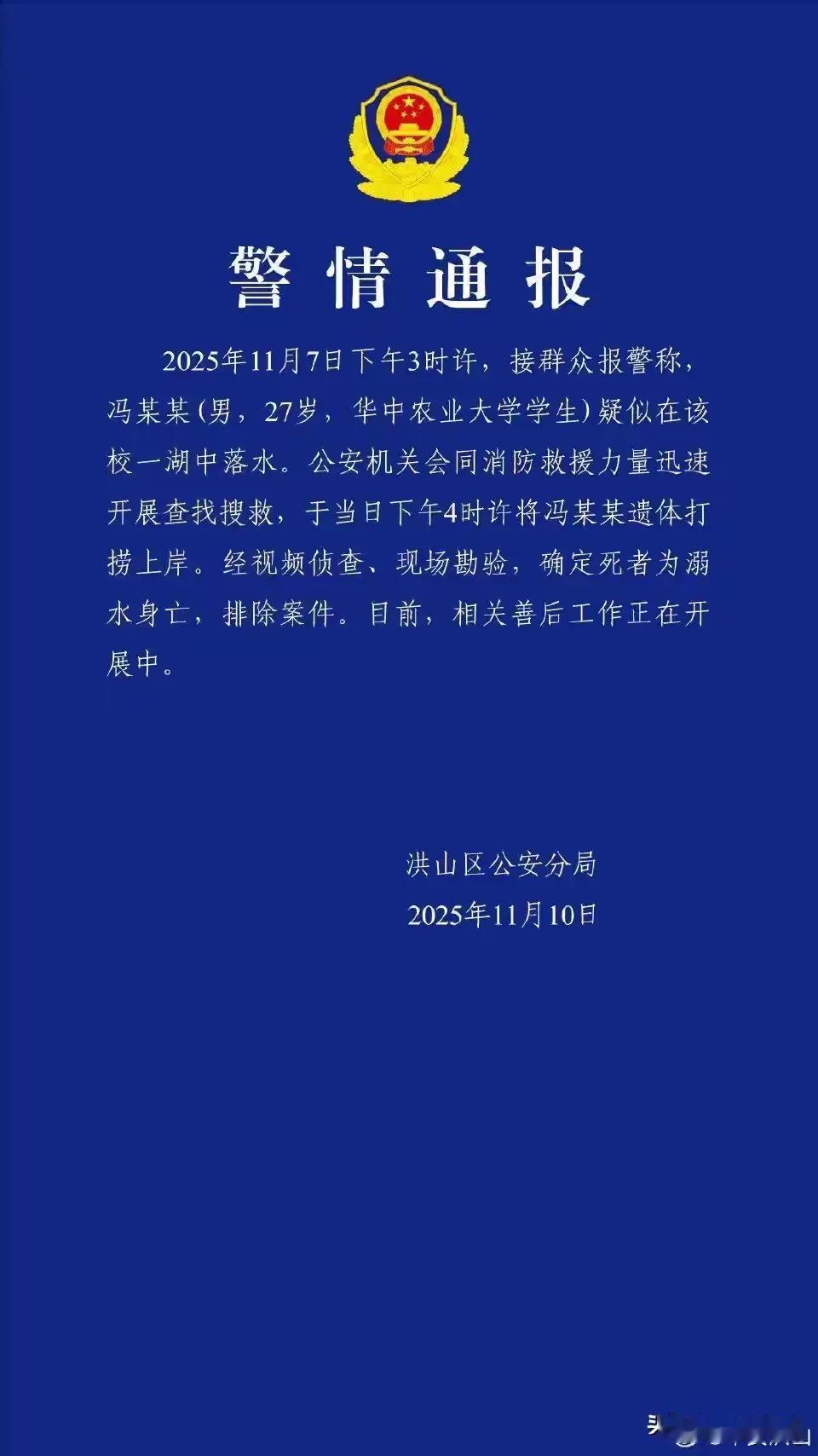 太不值得!网传华中农业大学博士生男子因为摘橘子,在学校湖中溺亡。事发2025年11月7日下午3时左右,冯某某(男,27岁,华中农业大学学生),在该校一湖中落水不幸溺亡。 为何会掉落湖中?有传言是因为去摘湖边的橘子,该说法目前不得而知是否属实,但是据拍摄现场情况确实是有一株橘子树。而且,警方通过监控调查和走访后,排除了刑事案件,其家属也在湖边烧纸为男子祈福。 这起事故让人心痛又气愤,27岁的高级素质人才,自己不会游泳,旁边也没有朋友在场的情况下,为何要去河边危险的地方?君子不立危墙下,这点道理还不明白,可怜了老父亲,辛辛苦苦培养一个博士生,就这样憋屈的没了。 27岁博士生在学校湖中溺亡 27岁高校男子为摘橘子掉落湖中溺亡