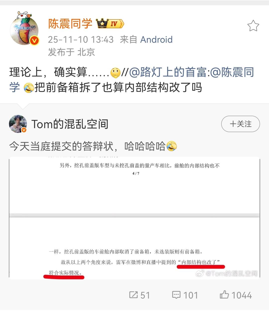 陈震:小米SU7 Ultra没有前备箱,理论上,确实算改了内部结构……[思考] 这件事情有非常大的关注度,大家都想看看小米SU7 Ultra碳纤维前机盖这件事情到底怎么解决,所以也很关注事情的进展,这是今天最新的消息。 各位是怎么看的?欢迎评论区留言。