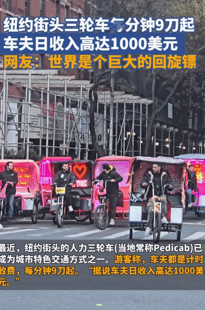 东升西落,美国多城市出现大批人力三轮车,车夫中有年轻男子、漂亮女大学生,当然中老年人也很多。11月10日,中国青年报报道,美国洛杉矶、纽约、华盛顿等大城市,出现大量拉客的人机三轮车。 据了解,他们都是专门从事这项工作的,各地收费标准不一样。以这位女大学生为例,她表示收费8.9美元一分钟,自己还携带了计时器,她说如果对方体重太重或者有多个人,还会增加费用。 网友们惊叹,中国逐渐步入科技强国,美国居然开始走下坡路,人力三轮服务业成为了热门生意。不知道是不是从中国三线城市学到的生意经,收费确实有点夸张,9美元1分钟,一个小时500多美元,非高产阶级是消费不起的。 美国多地城市出现客运人力三轮车 纽约人力三轮车收费1分钟9美元