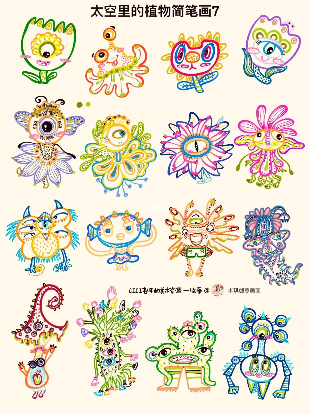 🪐一组有趣的创意植物、太空里的植物、奇形怪状的植物、多巴胺植物简笔画分享🥀 📚临摹,感谢米琪老师的创意。 🈶️以花朵为原形的, 🈶️加上昆虫或动物或鱼类的部分特征的, 🈶️各种功能、本领的:千里眼、顺风耳、机械手、跳舞、催眠等等。 🎨绘制方法步骤: 1⃣️根据植物的本领画出外形, 2⃣️添加点线面装饰, 3⃣️涂上鲜艳丰富的色彩。