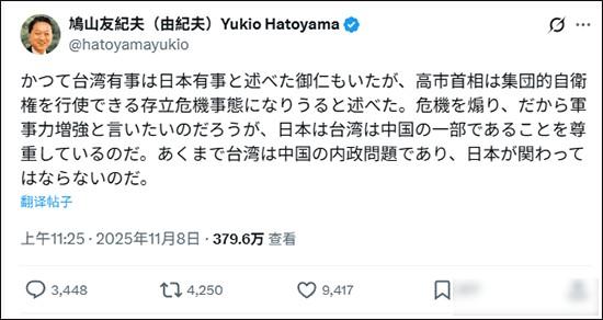 日本首相一句话,台海风险陡增,东亚安全悬了 11月7日,日本首相高市早苗在国会回答问题时提到,如果中国对台湾采取军事行动,可能会引发日本的存立危机事态,这句话听起来简单,其实很有分量,因为这是日本现任首相首次公开把台湾划入“他国”范围,相当于为自卫队今后介入台海局势开了一个法律上的口子。 三天后她赶紧出来澄清,说那只是假设性的回答,以后不会再用具体例子,但她没有否认那条法律本身,也没有收回“存立危机事态”这个说法,这就好像她说刚才只是在打比方,实际上在法律层面那扇门已经被打开了。 这个“存立危机事态”是2015年安倍政府提出的概念,意思是如果其他国家遭到攻击、日本也面临危险时,日本可以主动采取反击行动,不必等待美军支援,现在高市将台湾纳入这一框架中,相当于在法律层面承认台湾一旦发生事情就关系到日本的生存问题,这种做法显得相当大胆,因为台湾与日本没有正式外交关系,也不在日美安保条约的覆盖范围之内。 日本前首相野田佳彦立刻出来批评高市,说她太过冒进,没有考虑到政治上的后果,鸠山由纪夫在社交媒体上说得更直接,他指出这是拿台湾问题当借口来扩张军力,同时提醒日本应该记得台湾本来就是中国的一部分,中方反应更为强硬,驻日大使吴江浩发文强调台湾属于中国,任何想把日本拉入分裂中国道路的做法只会让日本走错方向。 这件事之所以敏感,是因为它打破了日本几十年的政治规矩,过去安倍就算私下说“台湾有事就是日本有事”,也只是模糊表态,但高市这回直接引用法律条文,把模糊战略变成了明确的操作指南,更麻烦的是她属于右翼阵营,背后想推动修改宪法、扩大军权,借台湾问题让日本摆脱战后体制。 从1972年中日建交起,日本政府一直避免将台湾问题与自身安全联系起来,即使2022年佩洛西访问台湾时,日本也没有在法理上采取行动,现在高市的言论打破了这一惯例,如果未来按照这个逻辑推进,中美直接冲突的可能性就会成为现实,而日本很可能最先受到影响。 我觉得这种话不应该在议会里随便说,尤其是现任首相更要注意,政治人物说话得考虑后果,特别是涉及战争与和平的问题,一句假设就可能让整个东亚的局势发生改变。高市早苗