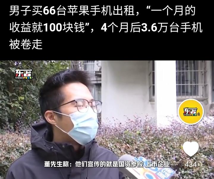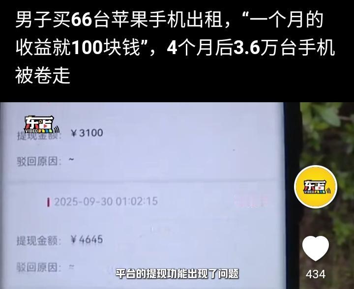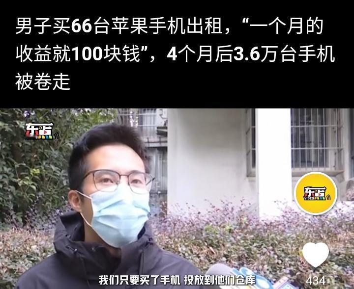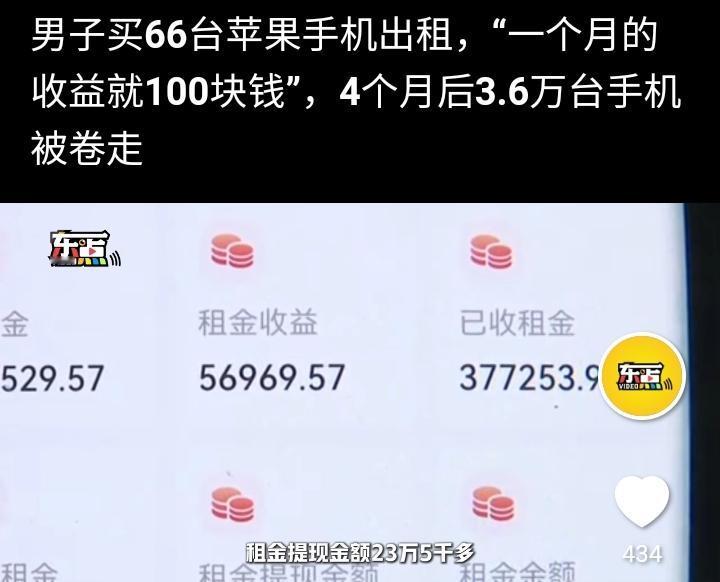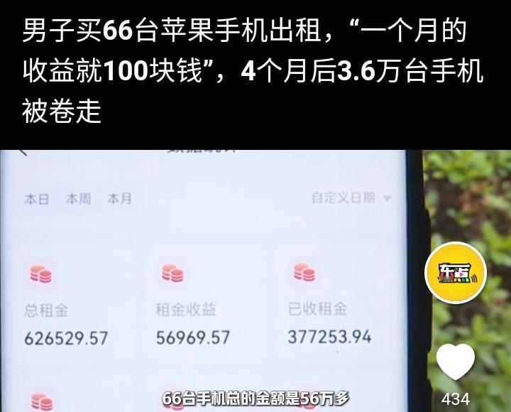 宁波的董先生今年5月2号通过一款APP购买两部苹果16Pro max共花费17780元然后交给一家平台出租,每个月租金100元,第一个月提现正常,他感觉特别的划算于是想多投入一点就可以躺平,他加大投资金额到56万,名下的手机数量增加到66台,这样每个月光收租金就高达66000元,一度让他特别的兴奋,甚至几个晚上都辗转难眠,就这样持续到9月底,再次提现出现审核敏感词,他觉得可能是平台太忙导致,等明天就会恢复正常,可第二天依然是在审核中,无法提现。 到目前为止他一共收取租金23万5千元,他的投入高达56万元,此刻他要求平台退回手机,可平台一直搪塞他,多次据理力争他意识到可能有诈,于是选择通过法律解决问题,平台表示董先生需要到公司总部面谈,并给了他一个公司负责人的电话,号称边总,可他去了以后也没说清楚到底怎么回事,边总的意思是投资方跑路把3.6万台手机也卷走了,平台也是受害方,可这个解释过于牵强,这本身就是一个局中局的诈骗套路,先给你一点甜头然后收割你。 马总说过:上当不是骗子太狡猾,而是你太贪,现在想想确实是那么回事,投资是一个风险很高的行业,没有特别清晰的思维勿进,容易破财。