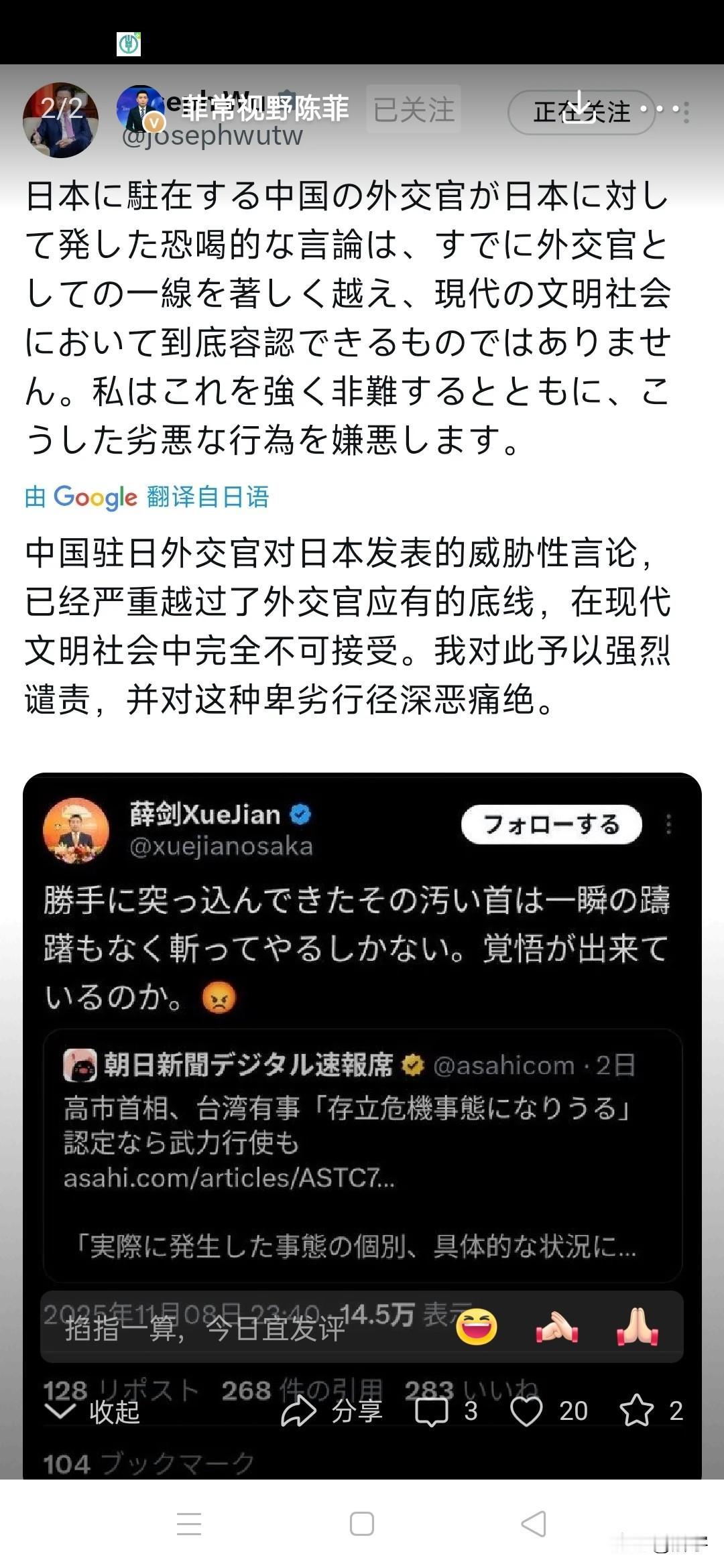 态度嚣张!台湾卷入中日舆论战! 刚刚浏览到一则令全体国人愤恨不已的消息,台湾卷入中日舆论战,态度格外嚣张! 据媒体报道,现台湾安全会议秘书长,民进党高层吴钊燮昨晚公开卷入中日激战正酣的舆论战,公然叫嚣道:“中国驻日外交官对日本发表的威胁性言论,……我对此予以强烈谴责,并对这种卑劣行径深恶痛绝。(全部内容见附图二)”吴钊燮这番言论,简直刷新了世人对台湾某些人无下限的认知,这些人的媚日程度简直令人发指,完全忽视了日据台湾数十年间对台湾的残酷压榨,和祖国母亲为了呼唤他们回家实行的惠台政策让他们年年顺差上千亿的鲜明对比,竟然在同胞与百年世仇日本发生争执之时,竟然悍然选边站队到民族仇敌日本那边,对无辜同胞大加讨伐,态度之恶劣嚣张,比之于日本竟然有过之而不不及,简直是妥妥的皇协军再现!对此,我们在愤怒之余应该高兴,因为这次舆论战可以是台湾人心的试金石,记住那些公然跳出来驸和日本的小丑们,他们就是民族罪人无疑,等待将来拉清单的时候,照单一网打尽就行了,中华大地上,没有他们的容身之地!