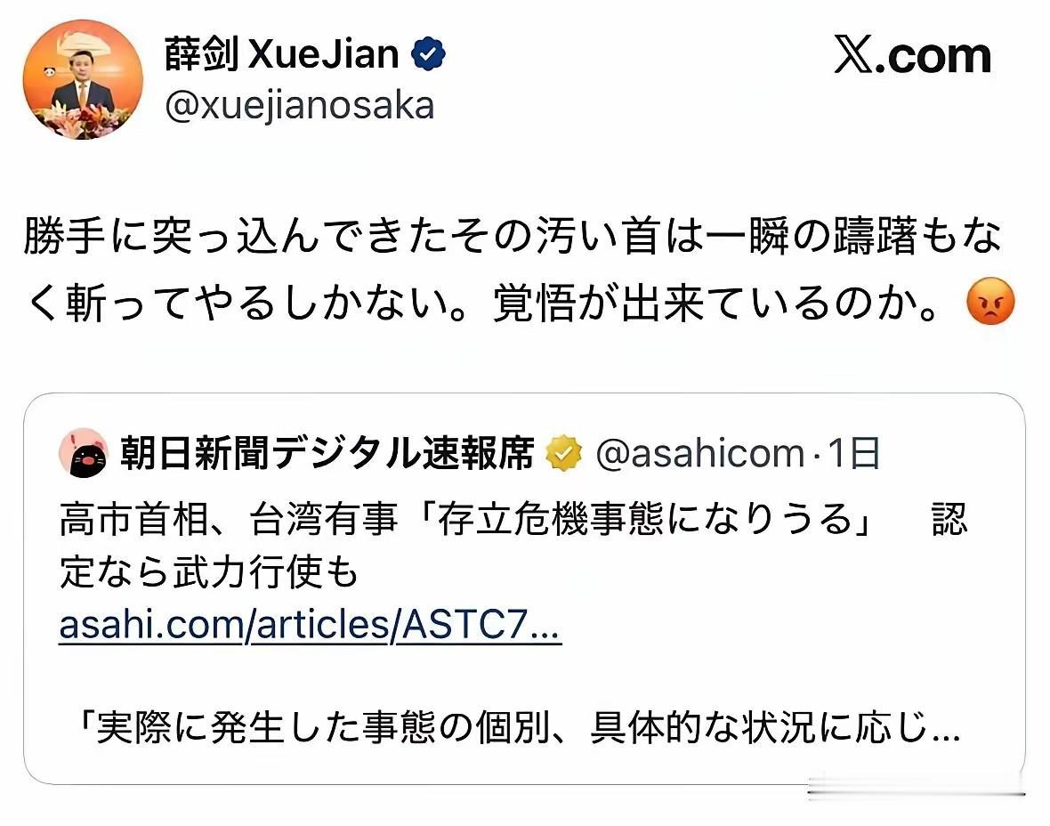 日本表示“强烈抗议” 中国驻大阪总领事,在社交媒体上发文“送到门口的肮脏货的脑袋,会毫不犹豫地斩下” 中日外交风波骤起!中国总领事一句硬话引爆舆论,日本抗议声浪不断 一则社交媒体上的强硬表态,让本就暗流涌动的中日关系瞬间升温。中国驻大阪总领事薛剑的一条帖子,以“对于擅自插手的那肮脏的首级,只能毫不犹豫地斩下”的尖锐措辞,直接引发日本方面的强烈抗议,两国间的舆论风波在短短几天内持续发酵,成为国际社会关注的焦点。 这场风波的源头,是日本首相高市早苗在国会的一次答辩。2025年11月7日,高市早苗在众议院预算委员会上公然将台海局势与日本“存亡危机事态”绑定,明确暗示若“台湾有事”伴随武力行动,日本可能动用集体自卫权介入。这一言论直接触碰中国核心利益,违背一个中国原则和中日四个政治文件精神,迅速引发中方强烈不满。 作为驻大阪总领事,薛剑于11月8日深夜在X(原推特)平台上作出回应。他转发了日本朝日新闻关于高市早苗涉台言论的报道,并附上那句极具冲击力的表态,末尾还追问“你是否已做好觉悟?”。 帖子一经发出,很快在日本网络空间炸开锅,日本网友纷纷留言指责,认为这是对一国首相的暴力暗示,有失外交官身份,甚至有人呼吁日本政府将其列为“不受欢迎人物”并驱逐出境。 日本外务省迅速作出反应,通过外交渠道向中国政府提出严正抗议,称中方外交官的言论“极不恰当”“有失常理”,要求中方给出合理解释并采取补救措施。 与此同时,日本国内的批评声浪持续高涨,不少媒体专门刊发评论文章,将此事定性为“外交挑衅”,认为这种带有威胁性的表述严重破坏了两国交往的基本礼仪。 值得注意的是,这并非薛剑总领事首次因社交媒体言论引发争议。2024年10月日本众议院议员选举期间,他曾在X账号上呼吁民众在比例代表选票上填写“令和”,为特定政党拉票。 这一行为被日本方面指为违反外交官不得干涉派驻国国内政治的国际原则,当时日本政府就已通过外交渠道提出抗议,帖子随后被删除。短短一年时间内两次引发外交摩擦,也让日本国内对其不满情绪进一步累积。 面对日本的强烈抗议,中方并未沉默。11月10日的外交部例行记者会上,发言人林剑作出回应,明确指出日本当政者妄图介入台海事务,是对国际正义的践踏、对战后国际秩序的挑衅,也是对中日关系的严重破坏。 林剑强调,相关言论与日本政府迄今所做的政治承诺严重不符,性质和影响极其恶劣,中方对此强烈不满并坚决反对,已向日方提出严正交涉。 而引发风波的核心帖子,在发布后不久便被薛剑本人主动删除,但这并未平息事态。日本方面认为,仅删除帖子而不道歉的做法“实在难看”,要求中方承担相应责任; 中方网友则大多支持总领事的强硬表态,认为面对外部势力干涉内政的行为,就应明确表明立场,捍卫国家核心利益。 事实上,中日双方的摩擦并非个例,此前也曾发生过因军机飞行路线引发的领空争议,日方曾以“侵犯领空”为由提出抗议,中方则回应无意侵入任何国家领空。 此次涉台言论引发的外交风波,再次凸显了两国关系中敏感问题的复杂性。作为一衣带水的邻邦,中日关系的健康稳定发展关乎地区和平与繁荣,而相互尊重、恪守承诺是两国交往的基本前提。 这场由社交媒体帖子引发的外交风波,究竟会如何影响后续中日关系的走向,双方是否会进一步采取外交措施,仍有待观察。但可以肯定的是,台湾问题是中国内政,任何外部势力都无权干涉,中方捍卫国家主权和领土完整的决心不容动摇。 对此,你们有什么看法,欢迎评论留言~