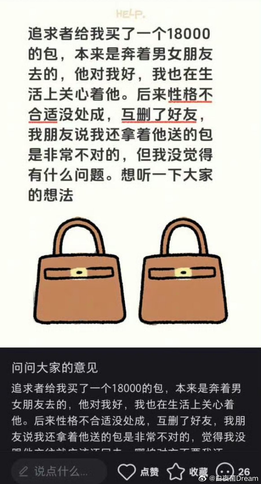 半夜起床唱国歌 2 2025-11-11 11:36 这包肯定不能要,都分了手,还拿着包干嘛,用来装分掉的手吗?哪天从包里掏出一只手咋办?晦气死了,听话,赶紧扔了,不然经常做噩梦,把自己给吓死那就更不值得了。