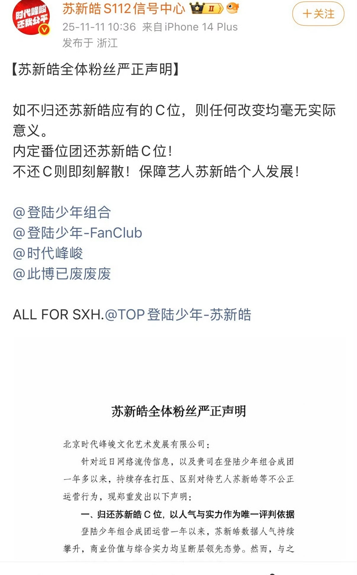 苏新皓粉丝发文要求归还苏新皓C位