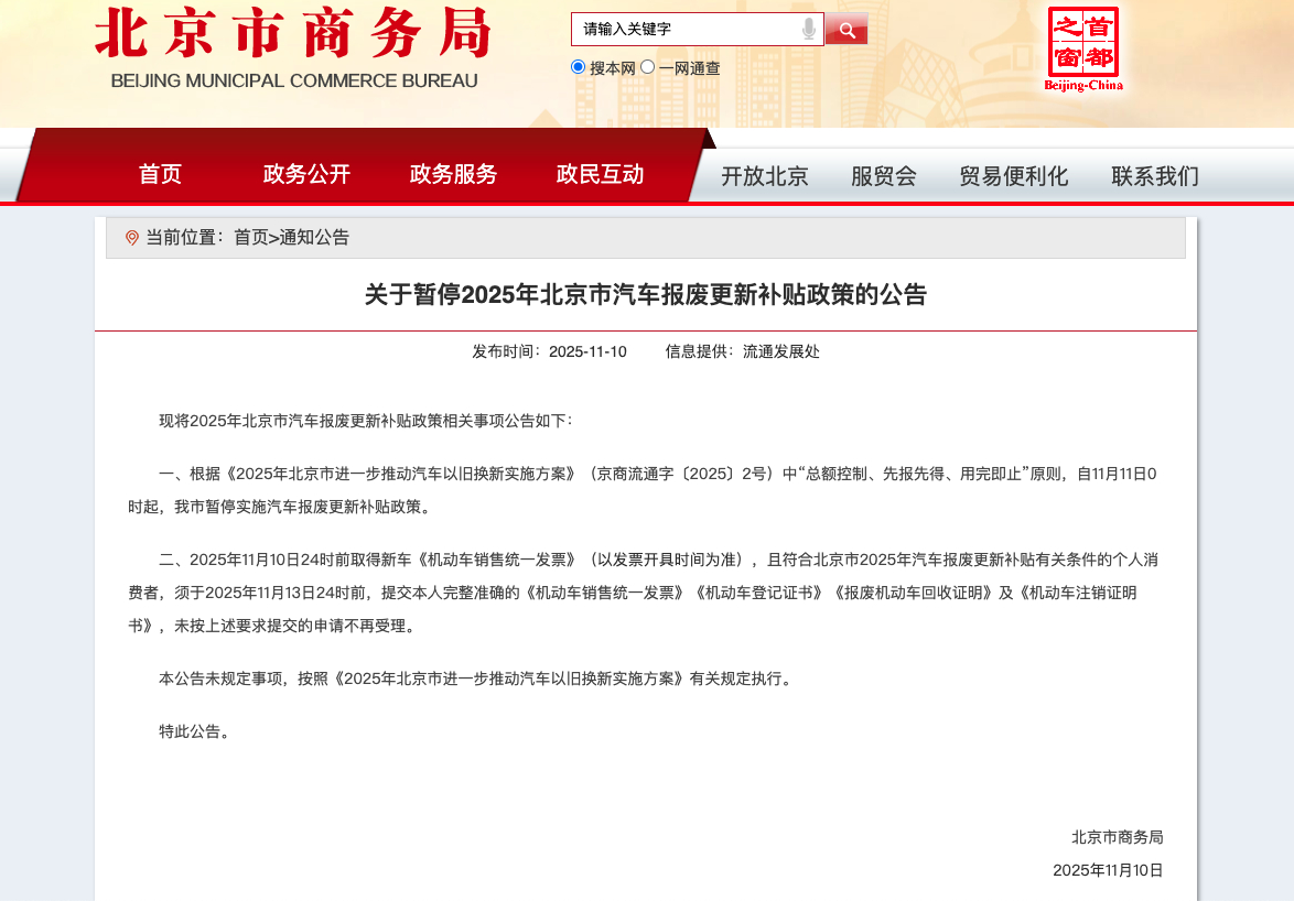 车若初见[超话] 深夜紧急通知,来的很突然,北京市汽车报废更新补贴也暂停了。这要是没领到补贴的可真就有点拍大腿了,购置税变了,报废补贴变了,不知道明年的政策是啥样?会影响你的买车计划吗?