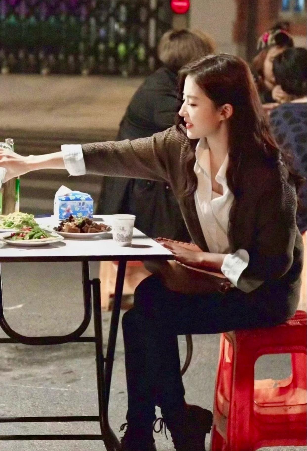 所以不能怪环境, 吃路边摊也是天仙也优雅得不要不要的, 所以不能怪穿搭, 平平无奇的白衬衣、棕色毛衣、黑长裤、黑鞋,怎么穿她身上这么好看! 感谢这部剧否则我怎么会见到刘亦菲吃路边摊是什么模样, 同时悸动的一颗心也终于死了, 因为明白只要人长得好穿什么坐在哪儿其实影响不大……[我想静静]