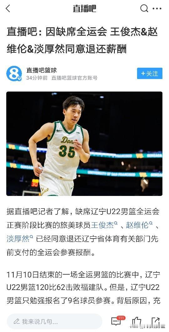 不打就退钱!旅美球员王俊杰、赵维伦和淡厚然三人已经同意退还辽宁男篮此前支付给他们的全运会参赛报酬。 在我看来,这合理合规,既然违约了,就应该按照合同来,退钱和赔钱,毕竟辽宁为了拿全运会男篮U22的金牌,当初下重本招募王俊杰、赵维伦和淡厚然三人代表辽宁男篮打全运会,为了能成功说服他们参赛,还开出了相当可观的夺冠奖金,今年夏天,王俊杰和赵维伦还特意从美国回来帮助辽宁U22男篮打全运会资格赛,但是由于加盟美国NCAA球队后,赛程冲突,他们三人拒绝代表辽宁参加全运会,所以辽宁有权追回此前支付给他们的预付款,好聚好散,王俊杰、赵维伦和淡厚然三人也同意退钱给辽篮!