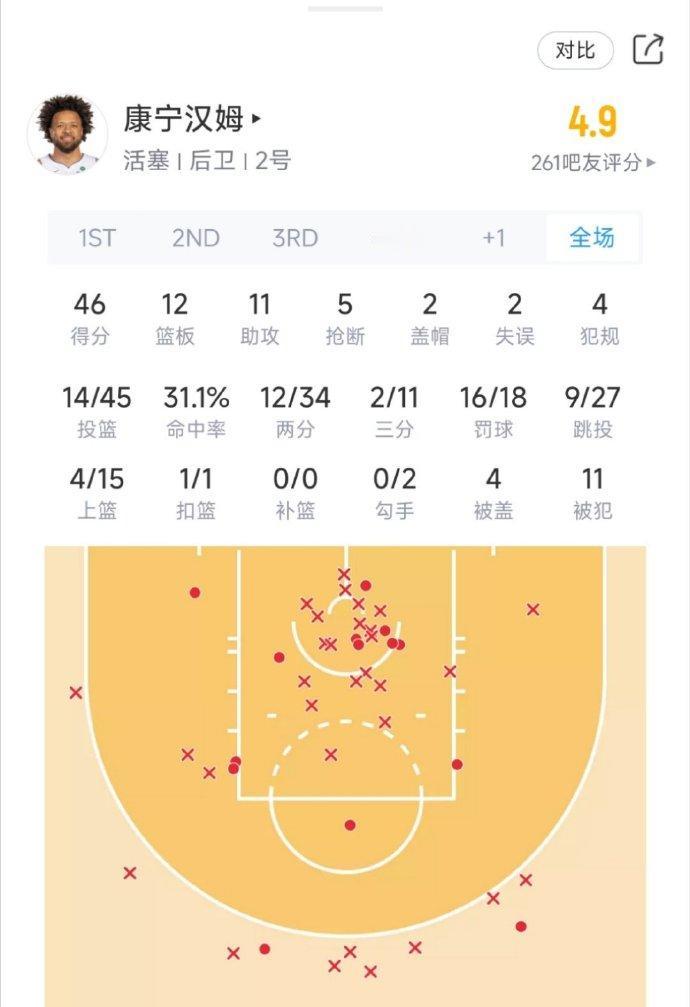吓人——坎宁安今天投了45个吗?单场31铁超科比! 31次打铁是自76-77赛季NBA和ABA合并以来的记录,超越科比的47中17。 45投14中,感觉好久没见过45投了,一直以为他是比卢普斯类型的,没想到这么敢投。 46+12+11+5抢断的恐怖数据也比肩乔丹,成为40+10+10+5数据第2人。 活塞7连胜东部第一,刚还拿了周最佳,活塞真崛起了!