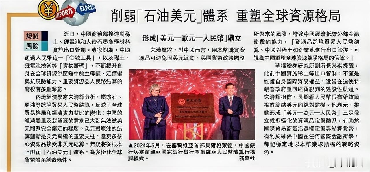 规避风险:削弱“石油美元”体系,重塑全球资源格局。据大公报,近日,中国商务部接连对稀土、锂电池和人造石墨负极材料实施出口管制。专家认为,中国通过人民币这一“金融工具”,以及稀土、锂电池技术等“实物筹码”,不断提升自身在全球资源供应链中的主导权、定价权与抗风险能力。重要资源品人民币结算的背后有多重深意。 内地经济学家宋清辉分析,铁矿石、原油等跨境贸易人民币结算,反映了全球贸易格局和经济实力对比的变化;中国的经济体量及对资源的需求已大到无法被美元体系完全锁定的程度。美元对原油的结算垄断是美元霸权的重要支柱,当更多核心资源品接受非美元结算,无疑将从根本上削弱“石油美元”体系,为多极化全球货币体系创造条件。 宋清辉说,对中国而言,用本币购买资源品可避免因美元波动、美国货币政策调整所带来的风险,增强中国经济抵御外部金融冲击的能力,“资源品跨境贸易人民币结算、中国对稀土和锂电池进行出口管控,可视为中国重塑全球资源竞争格局的信号。”