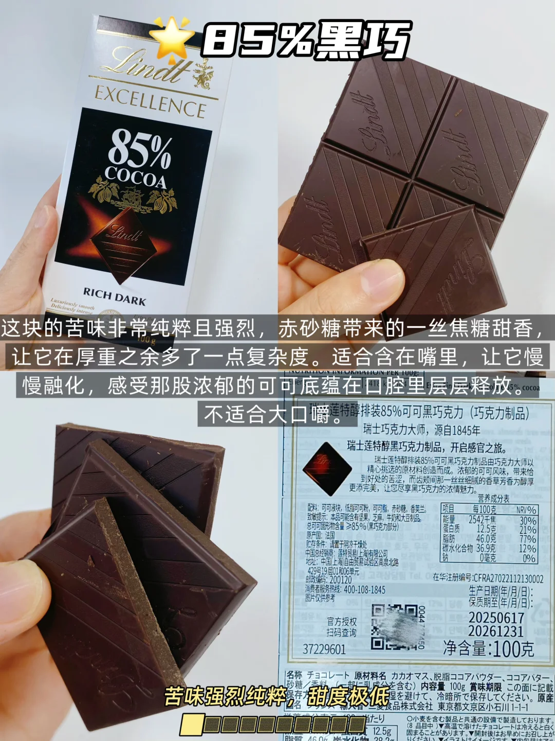 ▪️ 85%:能尝出黑咖啡和坚果的回香了,提神醒脑,资深爱好者最爱。