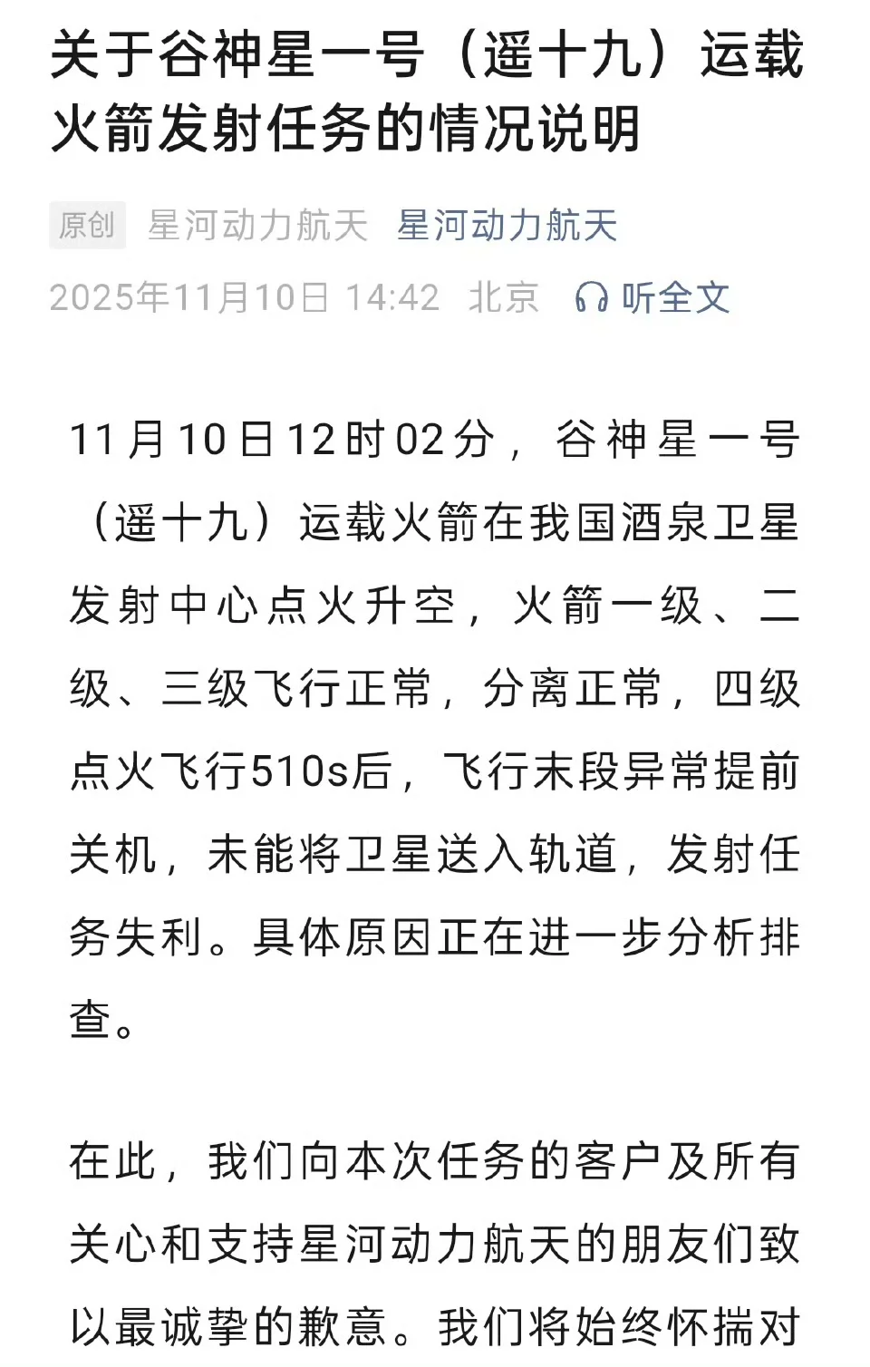 🚀今天谷神星一号遥十九运载火箭发射失败— —火箭一级、二级、三级飞行正常,分离正常,四级点火飞行510s后,飞行末段异常提前关机,未能将卫星送入轨道,发射任务失利。具体原因正在进一步分析排查。 (星河动力)