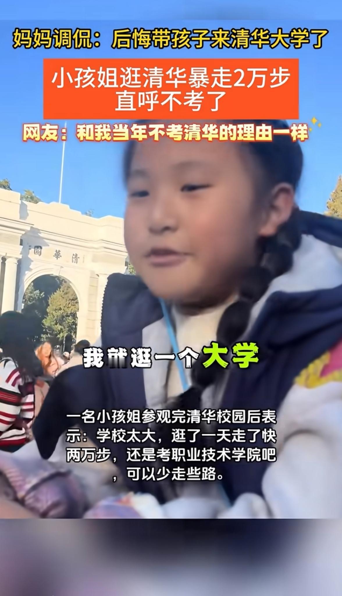 一名女子带着女儿去北京参观清华大学的校园,希望能够激励女儿,以后以这所学校为目标,谁料女儿逛完后出来,却直接跟女子 说,学校太大了,逛了一天走了快两万步了,还是考职业技术学院吧,可以少走一些路,对此女子感到非常无奈,已经后悔带女儿来逛学校了。 网友都觉得这姑娘想法天真又逗趣,清华可是无数学子的梦想殿堂,她居然因为怕走路就打了退堂鼓。换个角度想,孩子年纪小,想法自然单纯。这也反映出,咱们给孩子树立目标时,不能光讲大道理,得用更实际有趣的方式引导。 说不定哪天她真正了解清华的魅力,被深深触动,努力努力真就考上了呢。大家觉得呢?你们有啥引导孩子树立目标的好办法,快来评论区唠唠!清华