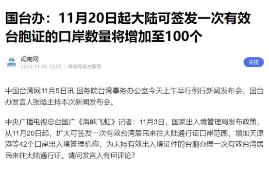 中国大陆的这一招绝了! 中国大陆官宣:从11月20日开始,大陆将扩大可签发大陆通行证的口岸范围。同时为岛内的民众来大陆旅行增加各种便利。按照国台办的说法是如果台湾同胞想来大陆玩只需要按要求提交合格的办证申请,30分钟内就能得到一张有效的台胞证,来一场说走就走的旅行了。这可比我们大陆同胞办身份证的速度还快啊!更重要的对首次来大陆的台湾同胞不仅办证免费,还有上千个景区可以免门票游览。 国台办在发布会上透露的办证效率,更是超出了很多人的预期。台湾同胞要是没提前办证,突然想趁着兴致来大陆走走,完全不用着急。 他们只要带着台湾地区的出入境证件和身份证,从世界各地坐飞机或者轮船直达大陆后,直接向入境口岸的公安机关出入境管理机构提交申请,短短30分钟就能拿到有效的一次入出境台胞证。 这个速度甚至比大陆同胞办身份证的常规流程还快,大陆相关部门在流程优化和服务提升上的投入可见一斑。 凭这张快速办好的证件,台湾同胞能在大陆合法停留3个月。要是觉得3个月不够逛遍大陆的好山好水,他们还能在大陆任意一个县级以上出入境管理部门申办5年有效期的卡式台胞证,提交申请表和相关材料后,最快4天就能拿到新证。 台湾同胞还能委托当地旅行社代办这张5年有效期的证件,不用自己跑前跑后办手续,办好后5年内就能随时来往大陆,真正做到“一次办理,多年省心”。 针对首次来大陆的台湾同胞,大陆还准备了专属福利,这份诚意更显厚重。这些被称作“首来族”的台湾同胞,不仅首次办台胞证不用花钱,一年内还能免费游览大陆近2500个景区。 这份景区名单都是精心挑选的,既有北京故宫、颐和园、天坛公园这些承载着历史文化的地标,也有张家界、黄山、九寨沟这些鬼斧神工的自然景观,更有布达拉宫、大昭寺这些充满民族特色的景点。 从最初推出1256个优惠景区,到后来陆续新增内蒙古呼伦贝尔大草原、河南龙门石窟、陕西华山等一大批景区,大陆各地都在用实际行动欢迎台湾同胞。 台湾各界对这项措施的热烈反应,更能说明它多受欢迎。在大陆创业的台商邹佩育听到消息后,马上就在朋友圈转发了政策解读,她提到,以前台胞在大陆网购购票、住宿、办理金融业务等方面遇到的麻烦,都随着这些便利措施慢慢得到了解决。 台湾竞争力论坛学会理事长庞建国也表示,这类惠民措施让台湾年轻群体对两岸关系有了更积极的看法,从暑期台湾青年来大陆实习参访的热潮里,就能清楚看到这种变化。 这些措施的推出,是大陆长期推进两岸融合发展的延续动作。2024年,两岸人员往来已经达到440.5万人次,比上一年增长53.8%,其中台湾同胞来大陆的就有402.3万人次。这样的增长态势,离不开持续优化的交流环境做支撑。 马英九先生两次带着台湾青年学生来大陆参访,和大陆师生聊得很投机;夏立言、洪秀柱等国民党代表人士也陆续带队访问,台湾好几位县市长也组团过来交流,这些活动能顺利开展,都需要便捷的通行政策打底。 国台办发言人张晗解读政策时说,台湾同胞是大陆人民的骨肉亲人,大陆一直重视听取台胞的意见建议,就是要让台湾居民来往大陆更方便。 为了让台胞没有后顾之忧,相关部门还明确说明,台胞在大陆办证或者入出境时,证件上不会有任何特殊标记,个人信息安全会受到严格保护。这种细致的考量,让便利措施多了几分暖意。 和过去两岸交流中存在的办证口岸少、流程繁琐等问题比起来,这次推出的措施正好解决了台胞来往大陆的痛点。以前有些台湾同胞因为怕办证麻烦,一直没安排来大陆;有些台胞想临时来场旅行,也被证件问题困住。 现在这些问题都解决了,30分钟快速办证、100个口岸可办、“首来族”免费福利等政策组合在一起,形成了一套完整的便利服务体系。 大陆推出这些措施,更深的用意在于促进两岸同胞的心灵相通。当台湾同胞拿着快速办好的证件,免费走进故宫感受中华文化的深厚底蕴,登上黄山欣赏大自然的壮美景色,在大陆的街巷里体验烟火气,他们对大陆的认知就会变得更立体、更真切。 这种面对面的交流、心贴心的沟通,比任何宣传都更有说服力。随着越来越多台湾同胞走进大陆,两岸同胞之间的了解会越来越深,隔阂会慢慢消除,“两岸一家亲”的理念也会在频繁的往来中扎根心底。 从政策的具体内容到实施细节,再到背后的情感分量,都能看出大陆推动两岸交流的真心实意。