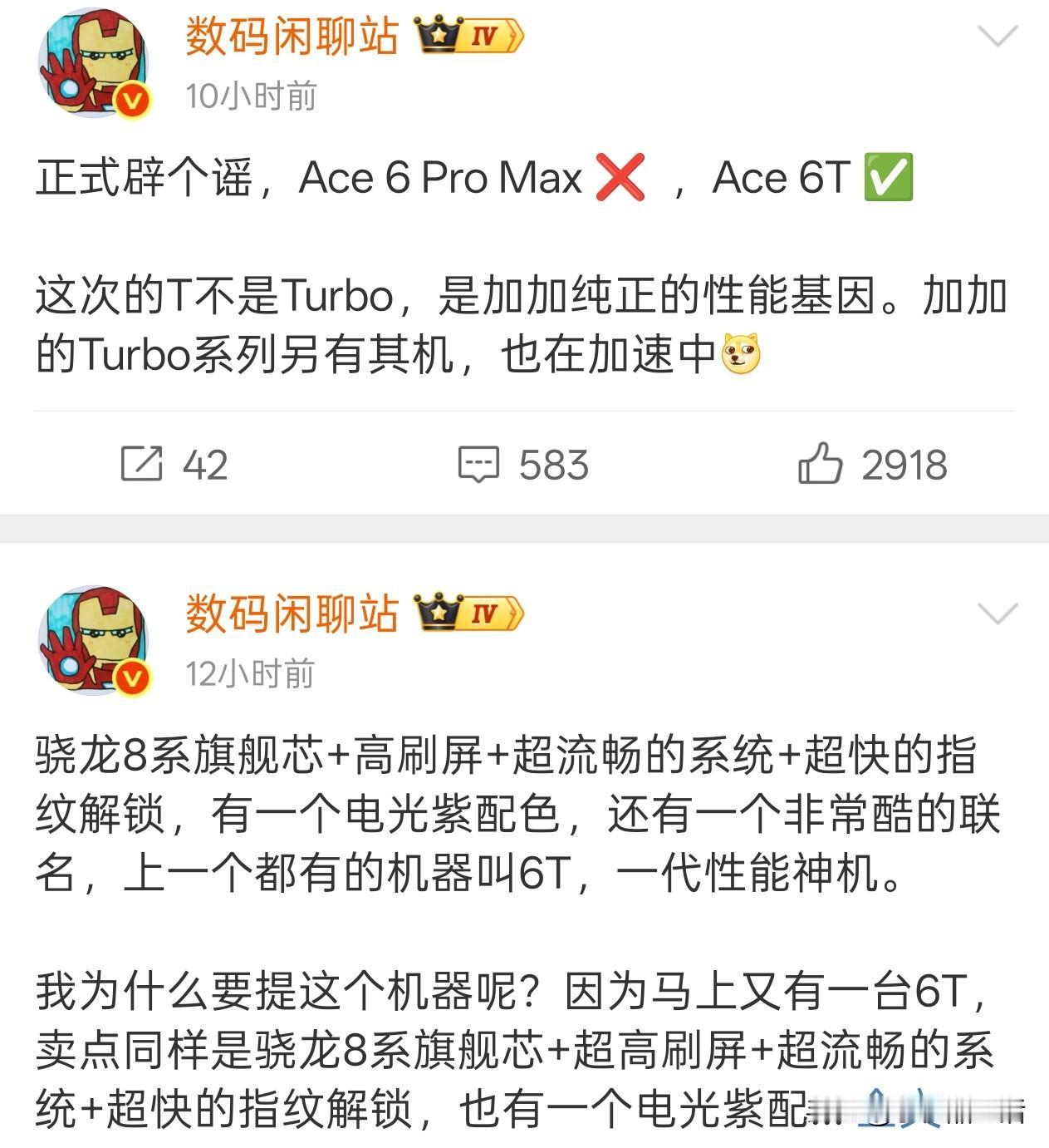 曝一加Ace 6T搭载高通骁龙8Gen5+165Hz超高刷屏! 近日,知名数码博主“数码闲聊站”爆料称这个月的一加新机不是一加Ace 6 Pro Max,而是一加Ace 6T。 据透露,该机将配备165Hz超高刷屏幕,搭载高通骁龙8 Gen5处理器,内置8000mAh±的大容量电池,会有电光紫配色,还会有非常酷的联名,另外还有超流畅的系统和超快的指纹解锁。 不得不说,一加Ace 6T的配置看起来还是挺不错的~你们期待吗?