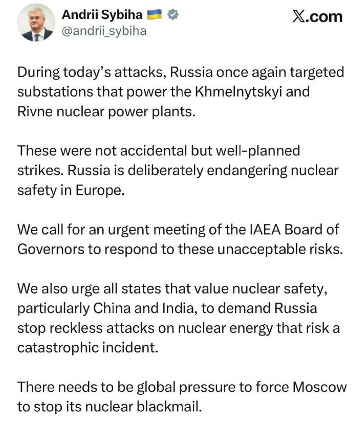乌克兰外交部长安德烈.西比哈发帖, 敦促中国和印度要求俄罗斯停止对核能设施的袭击(俄罗斯的空袭并未直接针对乌克兰核电设施) 西比哈:在今天(11月8日夜间)的袭击中,俄罗斯再次将目标对准了为赫梅利尼茨基和里夫尼核电站供电的变电站。 乌克兰外交部长安德烈・西比哈的一条社交平台帖子,很快引发了国际社会的关注。他在帖子里直接喊话中国和印度,要求这两个国家出面,敦促俄罗斯停止对乌克兰核能设施的袭击,还特意提到 11 月 8 日夜间的袭击中,俄罗斯把目标对准了为赫梅利尼茨基和里夫尼核电站供电的变电站。 不过,俄方随后的回应却显示,这次空袭并未直接针对乌克兰核电设施,双方的说法差异,让这件事变得更加复杂。 11 月 8 日夜间,乌克兰赫梅利尼茨基州和里夫尼州先后传来爆炸声,当地居民在社交平台上发布的视频显示,夜空被火光照亮,部分区域很快陷入黑暗。 乌克兰能源部门在事发后第一时间发布消息,称两个州的变电站遭到俄军导弹袭击,导致供电中断,而这两个变电站恰好负责为附近的赫梅利尼茨基核电站和里夫尼核电站输送电力。虽然核电站本身没有受损,但供电波动还是让工作人员启动了应急措施,确保反应堆安全运行。 西比哈正是基于这一情况,在第二天上午发布了那条敦促中印施压俄罗斯的帖子。他在帖子里强调 “核电站安全关乎全人类,俄罗斯的袭击已经威胁到周边国家的环境和民众安全”,还附上了变电站受损的现场照片,试图证明俄军行动的 “危险性”。 这条帖子很快被多国媒体转载,部分西方官员也跟风表态,要求俄罗斯 “停止针对民用基础设施的袭击”,一时间,舆论似乎都偏向了乌克兰一方。 但俄罗斯国防部随后的回应,却给出了不同的说法。俄方表示,11 月 8 日夜间的军事行动,目标是乌克兰境内的军事后勤设施,那些被袭击的变电站,其实是乌克兰军方用来为前线部队输送电力的关键节点,并非单纯的民用设施。 俄方还公布了空袭前的侦察照片,显示变电站附近有军用车辆停靠,证明这些设施被用于军事目的。此外,俄方强调 “在行动前已经评估过风险,确保不会对核电站本身造成威胁,空袭后核电站的运行参数也一直处于正常范围”。 要理清双方的分歧,就得先了解乌克兰核电站的供电逻辑。赫梅利尼茨基和里夫尼核电站虽然有自己的应急供电系统,但日常运行中仍需要外部电网提供稳定电力,用于冷却系统、控制系统等关键环节。 一旦外部供电中断,核电站会自动切换到应急柴油发电机,但这种方式只能维持有限时间,长期中断仍可能带来安全隐患。不过,从这次事件来看,两个核电站在供电中断后,都及时启动了应急措施,并未出现安全事故,这也从侧面印证了俄方 “未威胁核电站安全” 的说法并非没有依据。 事实上,俄乌冲突爆发以来,双方在基础设施袭击问题上一直存在争议。乌克兰多次指控俄罗斯袭击民用基础设施,包括电厂、水厂、变电站等,导致大量民众生活受影响; 而俄罗斯则反复强调,其军事行动只针对军事目标,偶尔波及民用设施是 “不可避免的附带损伤”,且乌克兰有时会将军事设施伪装在民用建筑附近,增加了俄军行动的复杂性。这次针对核电站变电站的袭击,不过是双方此类争议的又一次体现。 西比哈选择敦促中国和印度施压俄罗斯,也有其特殊考量。中国和印度作为全球主要大国,在俄乌冲突中一直保持中立立场,既没有向任何一方提供武器,也多次呼吁通过和平谈判解决争端,在国际社会拥有较高的话语权。 西比哈希望借助中印的影响力,迫使俄罗斯改变军事策略,同时也想通过这种方式争取更多国际社会的支持,尤其是非西方国家的同情。 不过,从目前的情况来看,中印两国并未对西比哈的呼吁作出直接回应。中国此前多次强调 “各国的主权和领土完整应得到尊重,同时也要考虑各国的安全关切,解决冲突的根本途径是对话谈判”,印度的立场也与之类似,更倾向于推动双方停火止战,而非单方面施压某一方。这种中立态度,也让西比哈的 “敦促” 暂时没有取得预期效果。 此次变电站袭击事件,再次凸显了俄乌冲突中基础设施安全的重要性。无论是民用还是军用设施,一旦涉及核电站这类敏感目标,任何军事行动都可能引发严重后果,甚至威胁到全球安全。如何在冲突中保护关键基础设施,避免局势进一步升级,不仅需要俄乌双方保持克制,也需要国际社会发挥更积极的协调作用。 对此,你们有什么看法,欢迎评论留言~