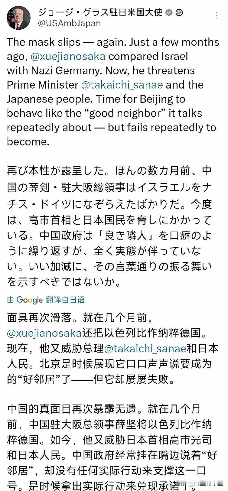美驻日大使:也开口了 就在薛剑痛斥高市早苗余音绕梁之际,美国驻日大使格拉斯憋不住了。11月10日推文称:“中国的真面目再次暴露无遗。就在几个月前,中国驻大阪总领事薛剑将以色列比作纳粹德国。”。 同学们,不只是中国人认为以色列对加沙的无辜冤魂做的孽堪比当年纳粹对付犹太人,全世界多数人包括美国的欧洲盟友都这样认定的。至于好邻居,要看对谁,试看看中国的邻居,中国人对哪一个不是善意满满的,包括对日本,不是也开放了日本海产品了吗?这一次不是中国人做错了什么,而是高市早苗作为日本首相挑衅中国!我们要问美国,如果有人说阿拉斯加或者夏威夷有事,就是我们有事,美国人会怎样? 划重点:中国人的本来面目早就清清楚楚,就是正大光明。反而是自诩是山顶之国的美国到处耀武扬威,搞得世界不得安生。 (观点不同不出恶声)