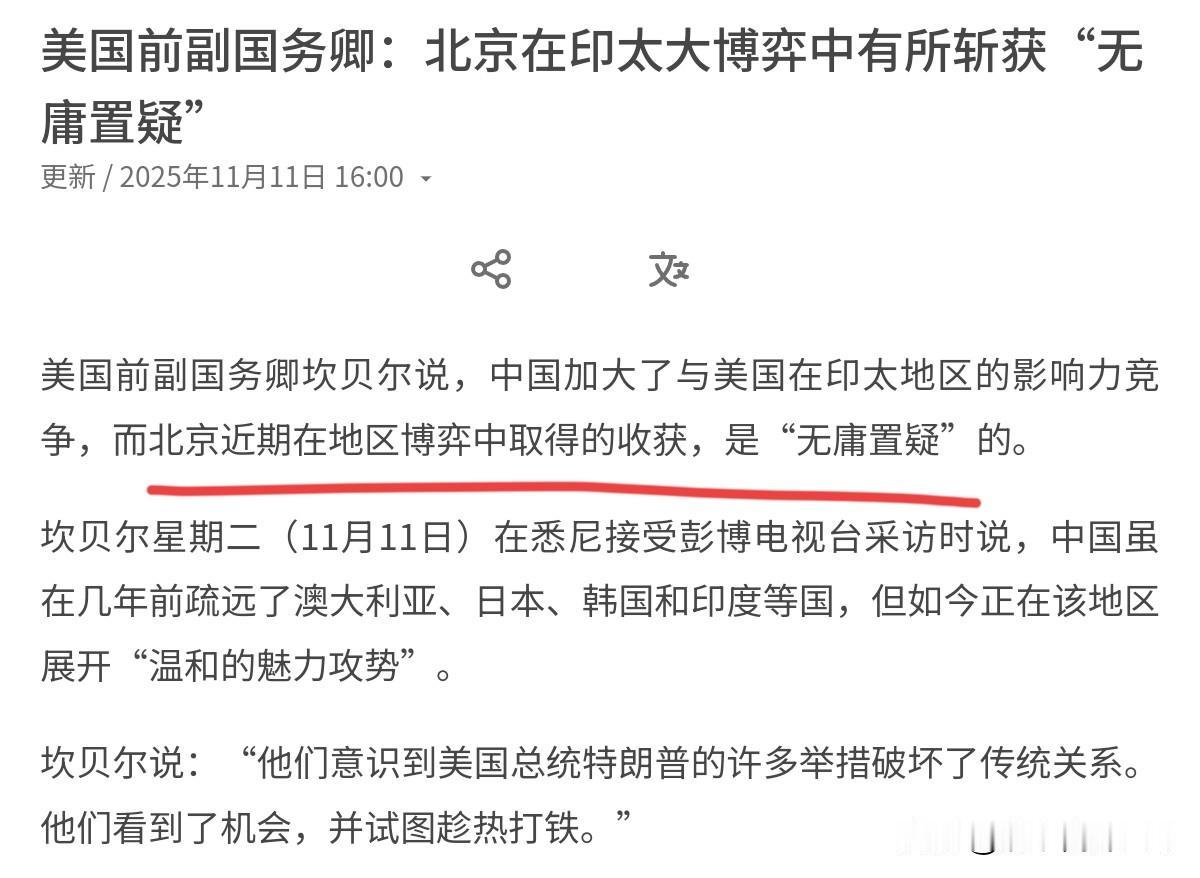心里面堵得慌,美国的前副国务卿坎贝尔出来说话了!11月11日,坎贝尔表示,中国加大了与美国在印太地区的影响力竞争,北京近期在地区博弈中取得的收获,是一点是无庸置疑的。坎贝尔表示,中国虽在几年前“疏远”了澳大利亚、日本、韩国和印度等国,但如今正在该地区展开温和的魅力攻势。 坎贝尔声称:他们意识到美国总统特朗普的许多举措破坏了传统关系。他们看到了机会,并试图趁热打铁。自二战结束以来,美国明显掌控印太地区,中国如今寻求在被视为“自家后院”的地区重塑自己的影响力。在大博弈方面,中国已迈出了一些重要步伐,并拥有一些优势。 很显然,这位美国前政客虽然对中国的偏见依旧,但此人也不得不承认中国在印太的影响力越来越大了。当然,我们必须指出的是,坎贝尔所谓的,中国在几年前“疏远”了澳大利亚、日本、韩国和印度等国,在被视为“自家后院”的地区重塑自己的影响力,这种认知完全是颠倒黑白的。 在拜登政府时期,美国拉着日本,韩国,印度,澳大利亚围堵我们,坎贝尔声称是我们远离这些国家,这非常的荒谬,显然印太根本不是谁的后花园。无疑,看见我们区域影响力越来越大,这位政客心里面堵得慌,因为这位有“印太沙皇”之称的政客,亲眼看见自己的心血付之东流了,而不得不看着局面这样发展,有心无力,沦为看客。显然,我们当然要塑造有利于我们的周边局势,而这是对美国围堵战略最好的回敬!