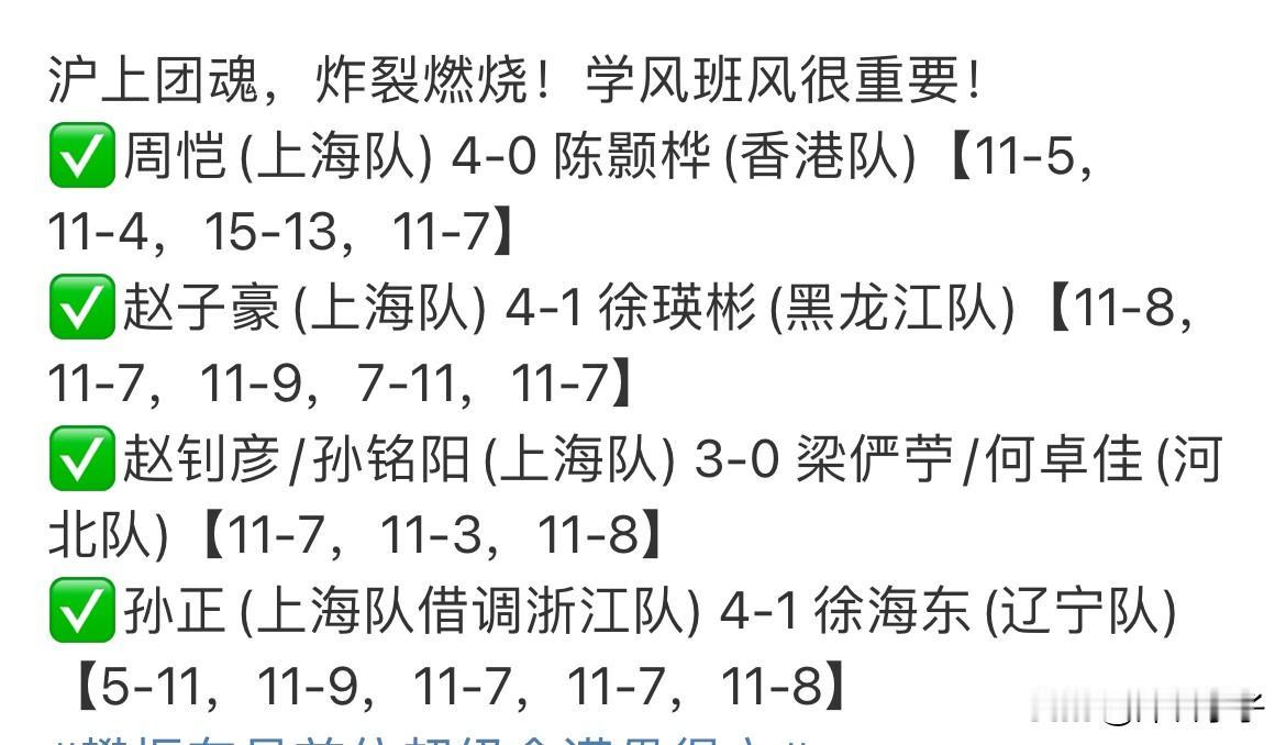 跟优秀的人在一起想不优秀都难! 在第十五届全国运动会上,男单1/16决赛周恺(上海地产集团队)4:0战胜陈颢桦(香港队)。 恭喜周恺晋级16强。上海队全运会男单四人,除赵钊彦以外,其他全部晋级。 崇明岛又称聪明岛,哈哈,呼吸了聪明岛的空气,人都是聪明的! 陈颢桦在亚锦赛打得可圈可点,可见上海队集体涨球了! 所以小时候妈妈都说要和学习好的人一起玩,现在沪队各自表现亮眼,看来和学覇一个班,学风班风很重要。 在全运会种子位岀来的时候,有很多人质疑周恺,今天,周恺用实力告诉大家:种子实至名归! 全运会